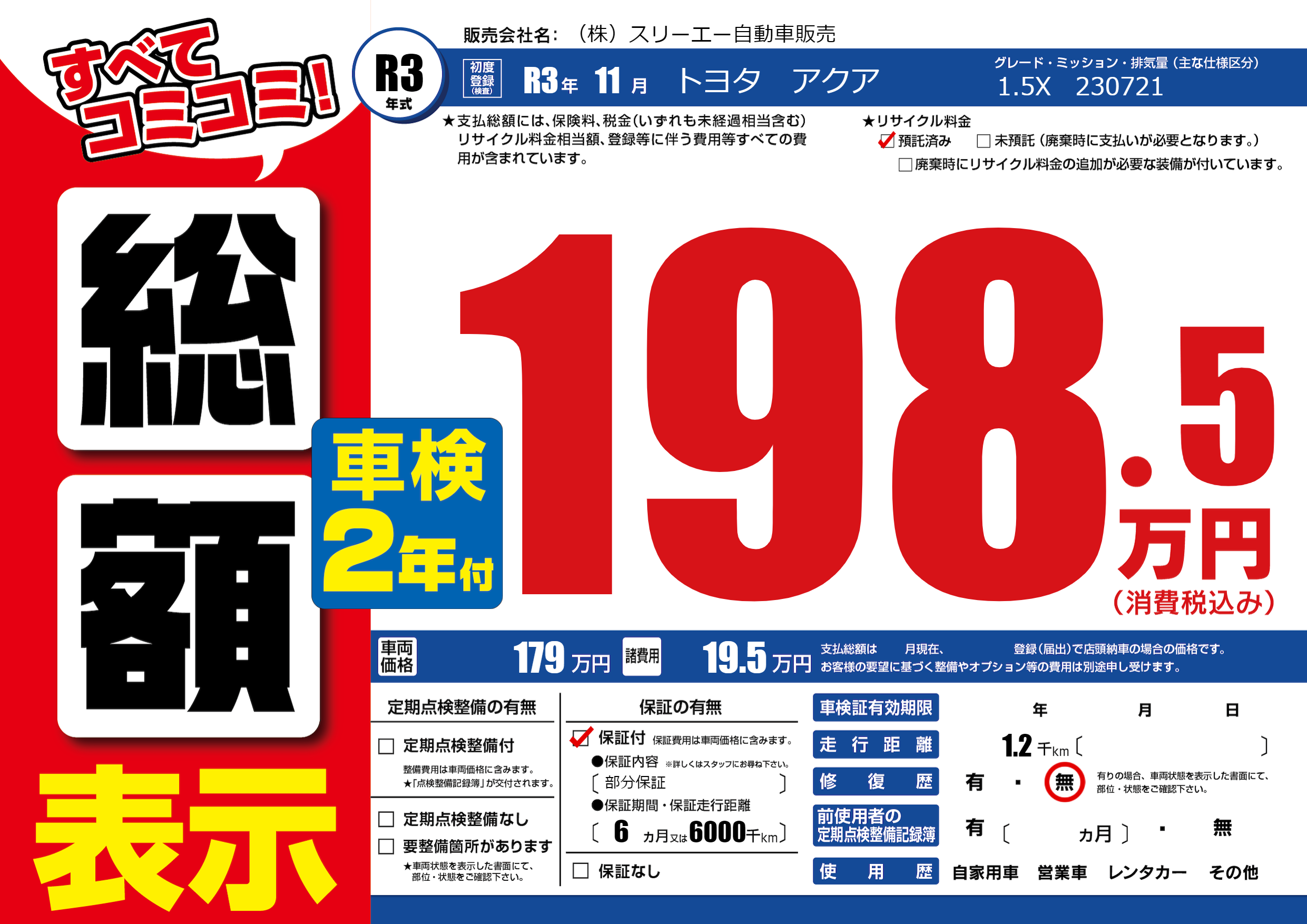 保証付き 保証内容(部分保証) 6ヶ月または(6000)千kmまで |
