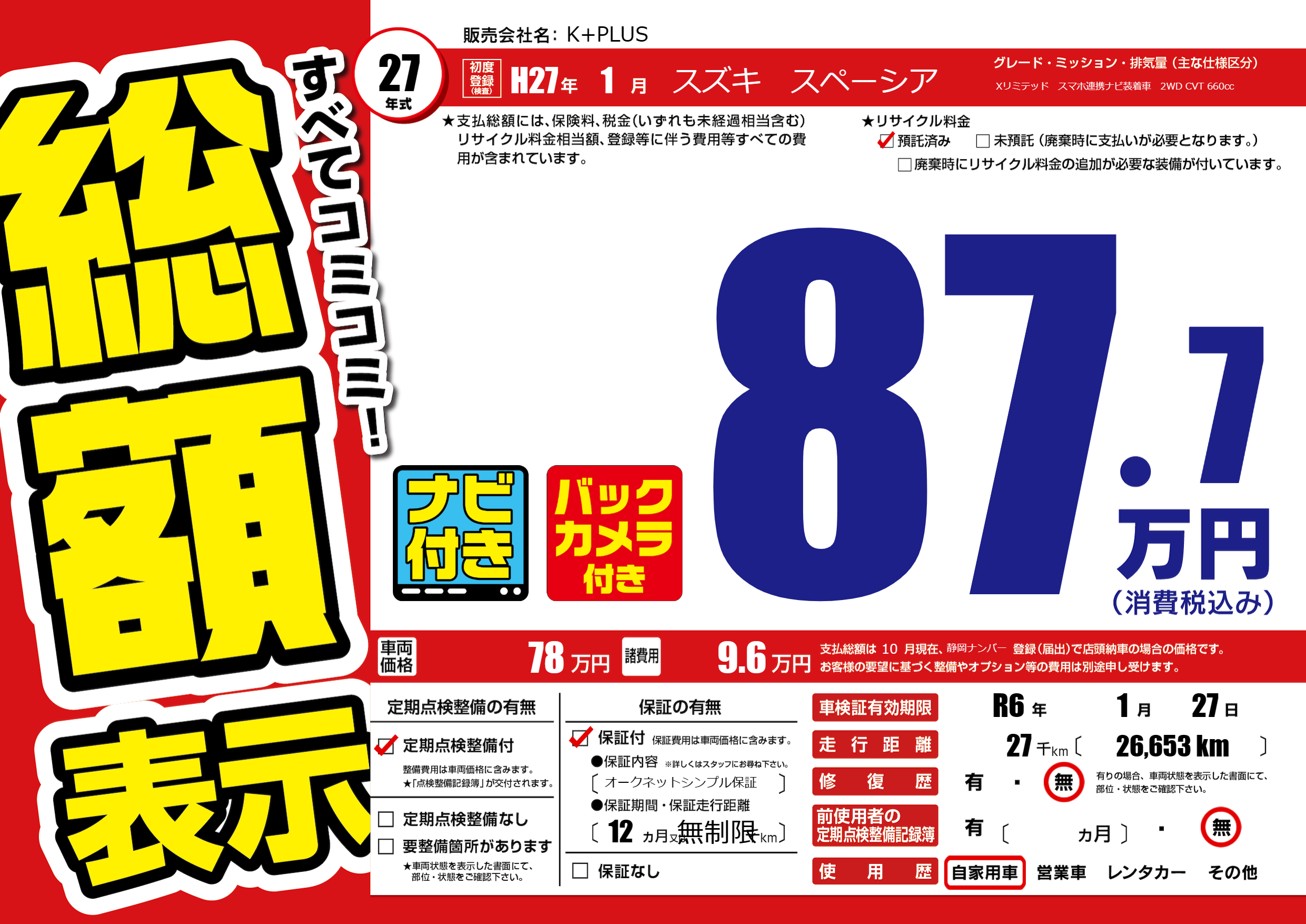 | 走行キロ | 2.7万km | 初年度登録 | H27年1月 |