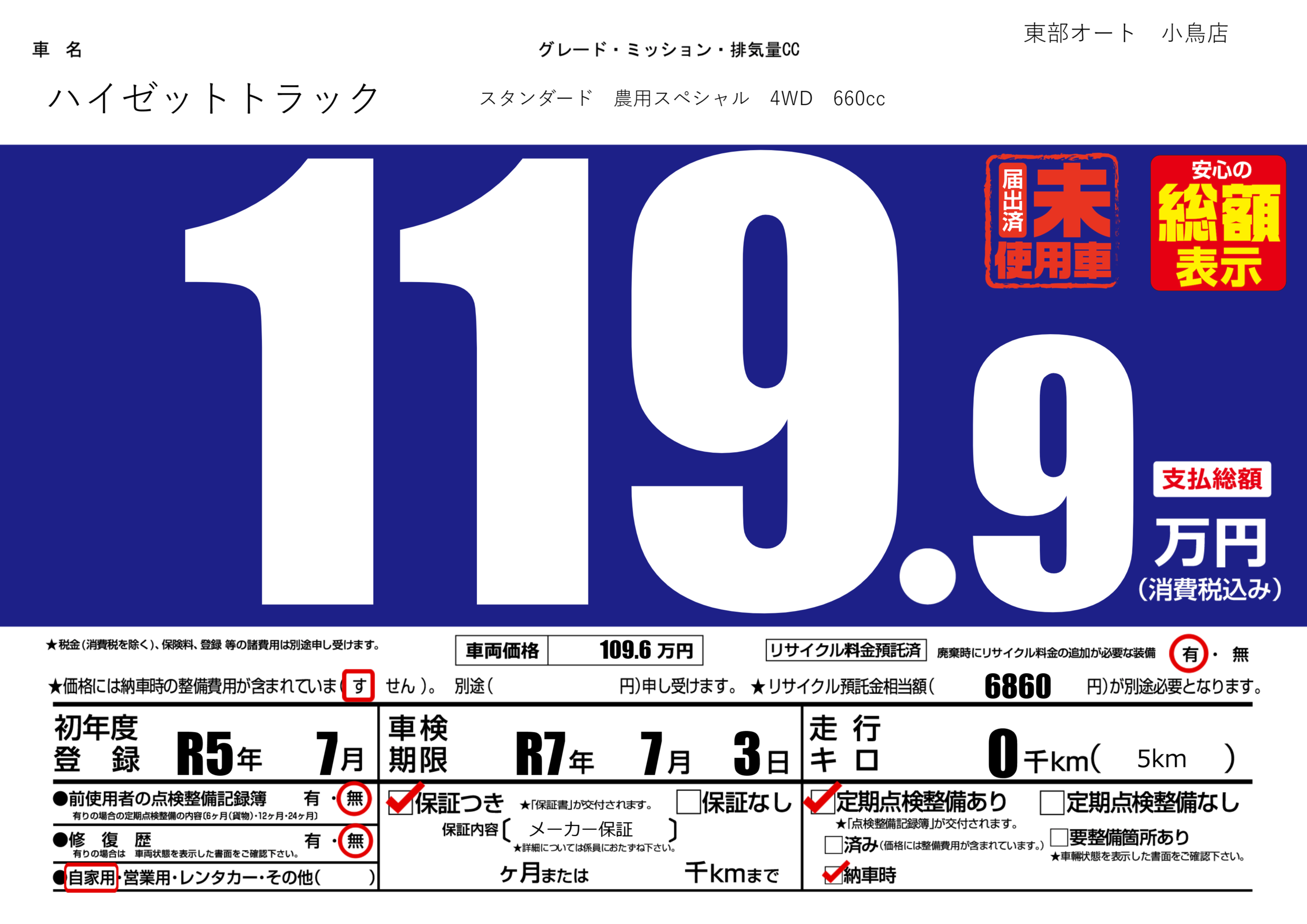| 定期点検整備 | 定期点検整備あり 納車時あり | ||