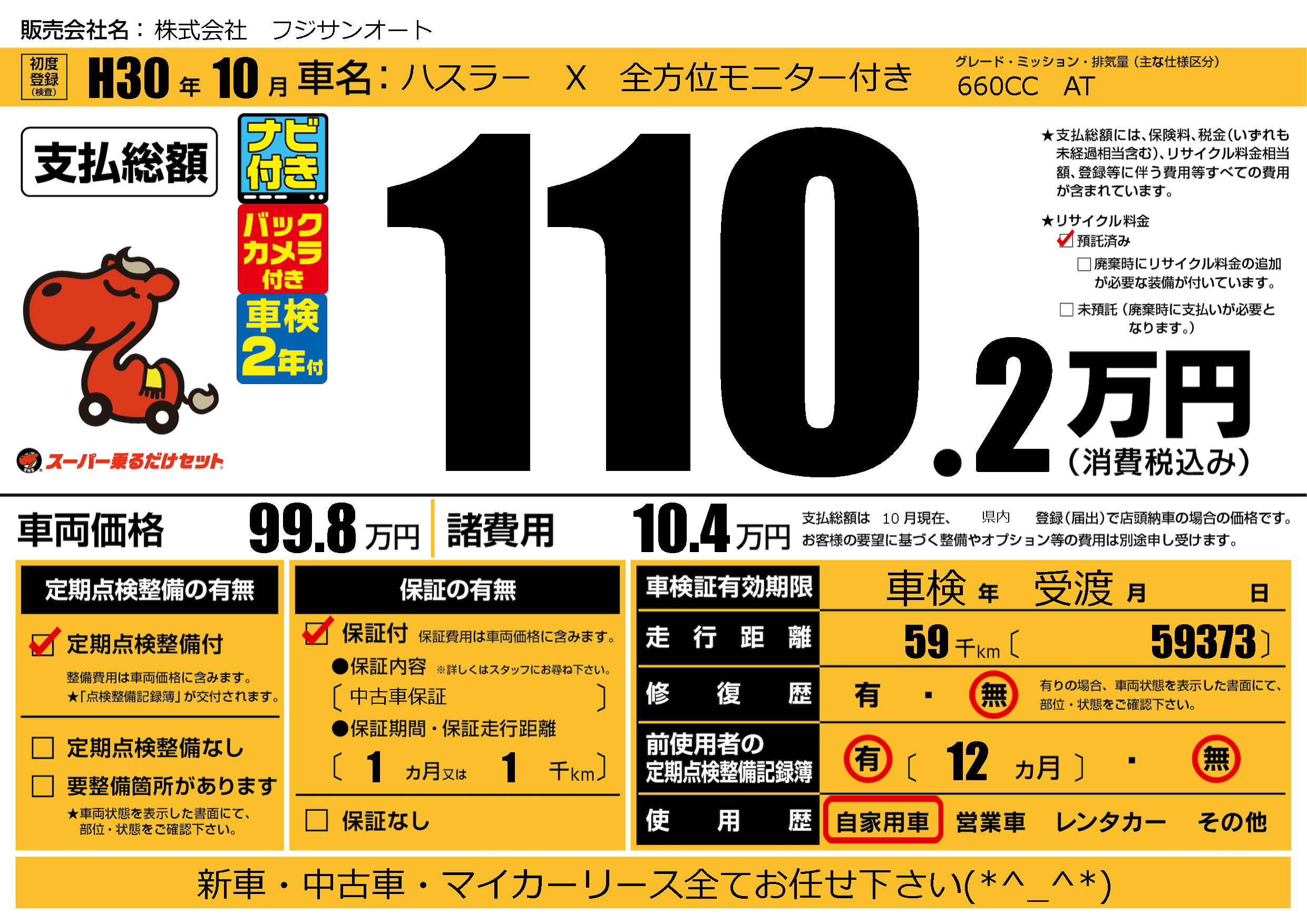 | 車名 | ハスラー X 全方位モニター付き | グレード ミッション 排気量 |