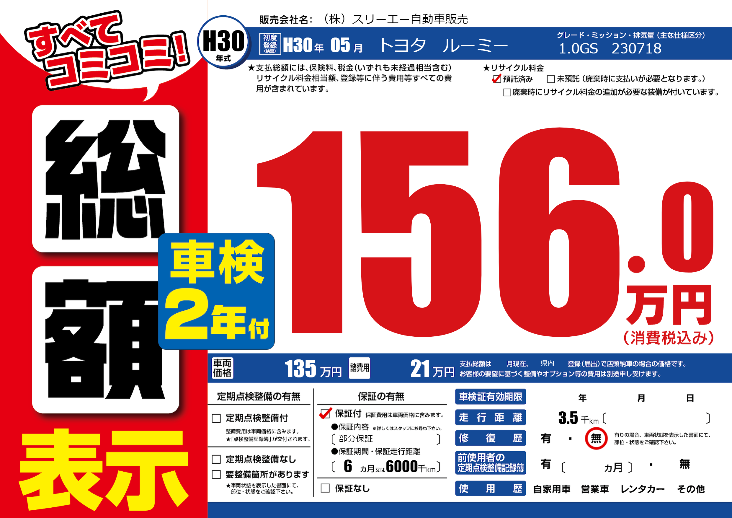 | 車名 | トヨタ ルーミー | グレード ミッション 排気量 |