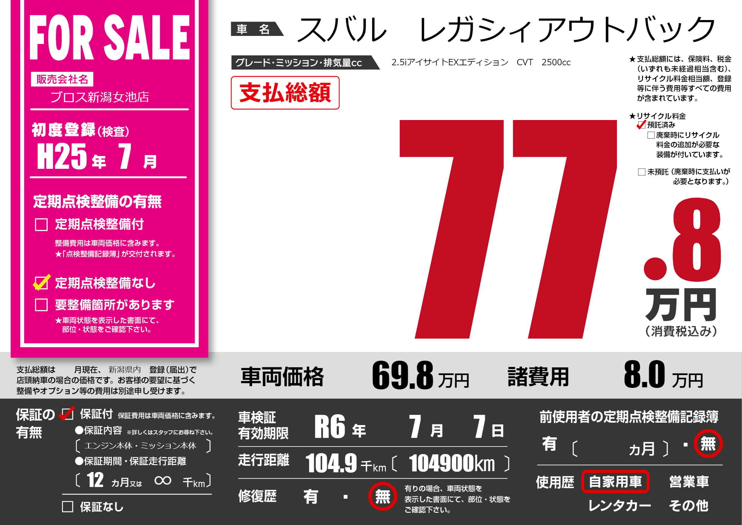 | 車名 | スバル レガシィアウトバック | グレード ミッション 排気量 |