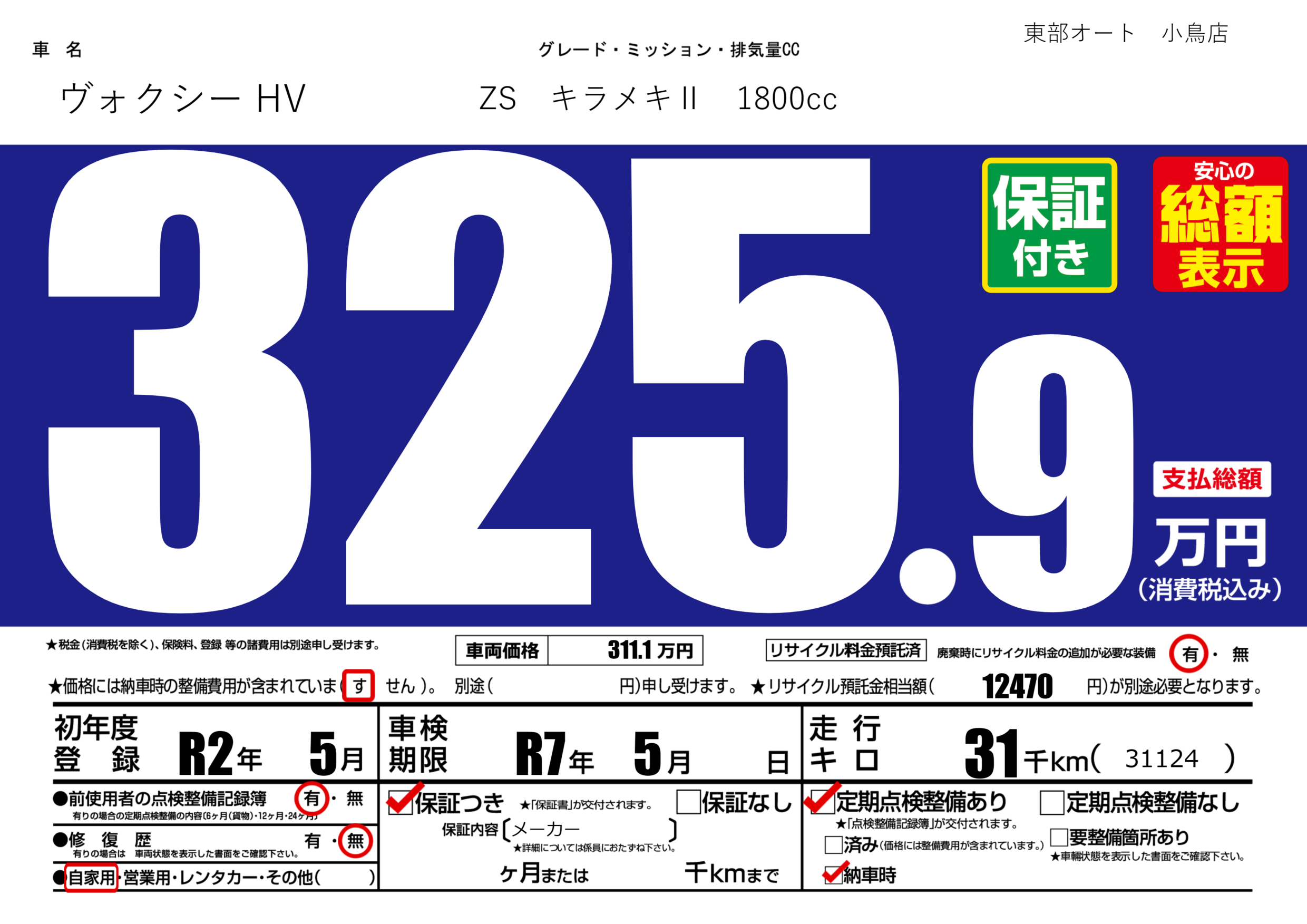 | 車検制限 | R7年 5月 - 日 | ||