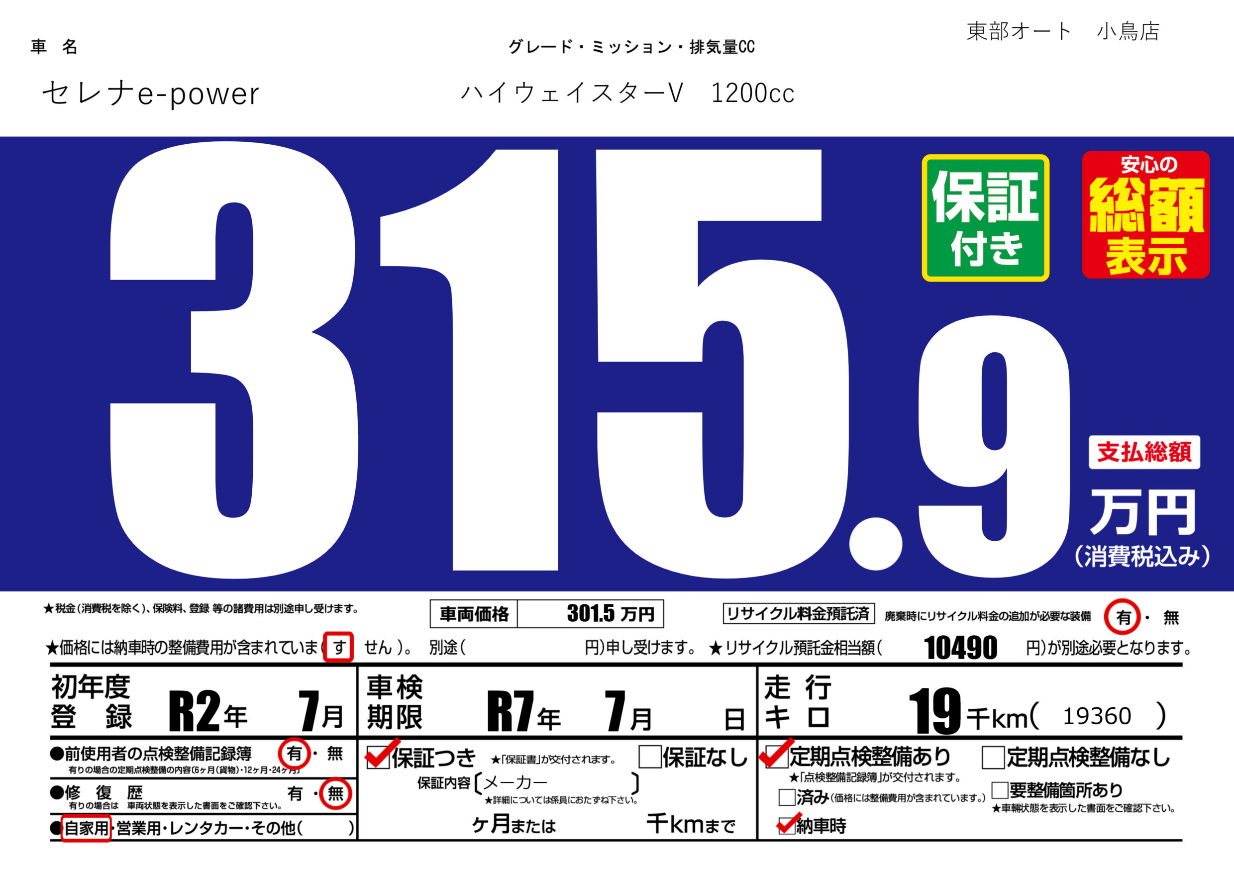 | 車名 | セレナe-power | グレード ミッション 排気量 |