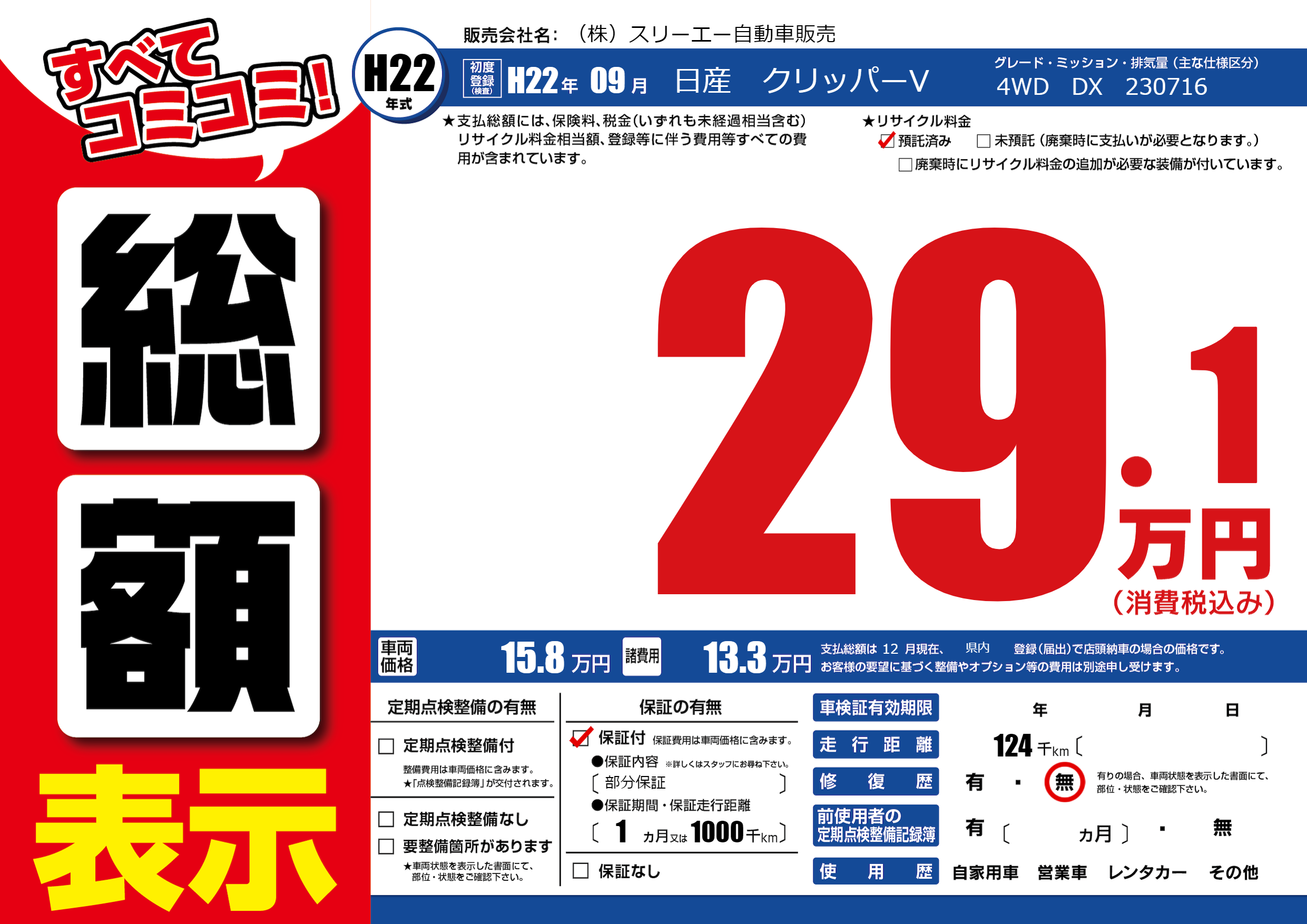 | 車名 | 日産 クリッパーV | グレード ミッション 排気量 |