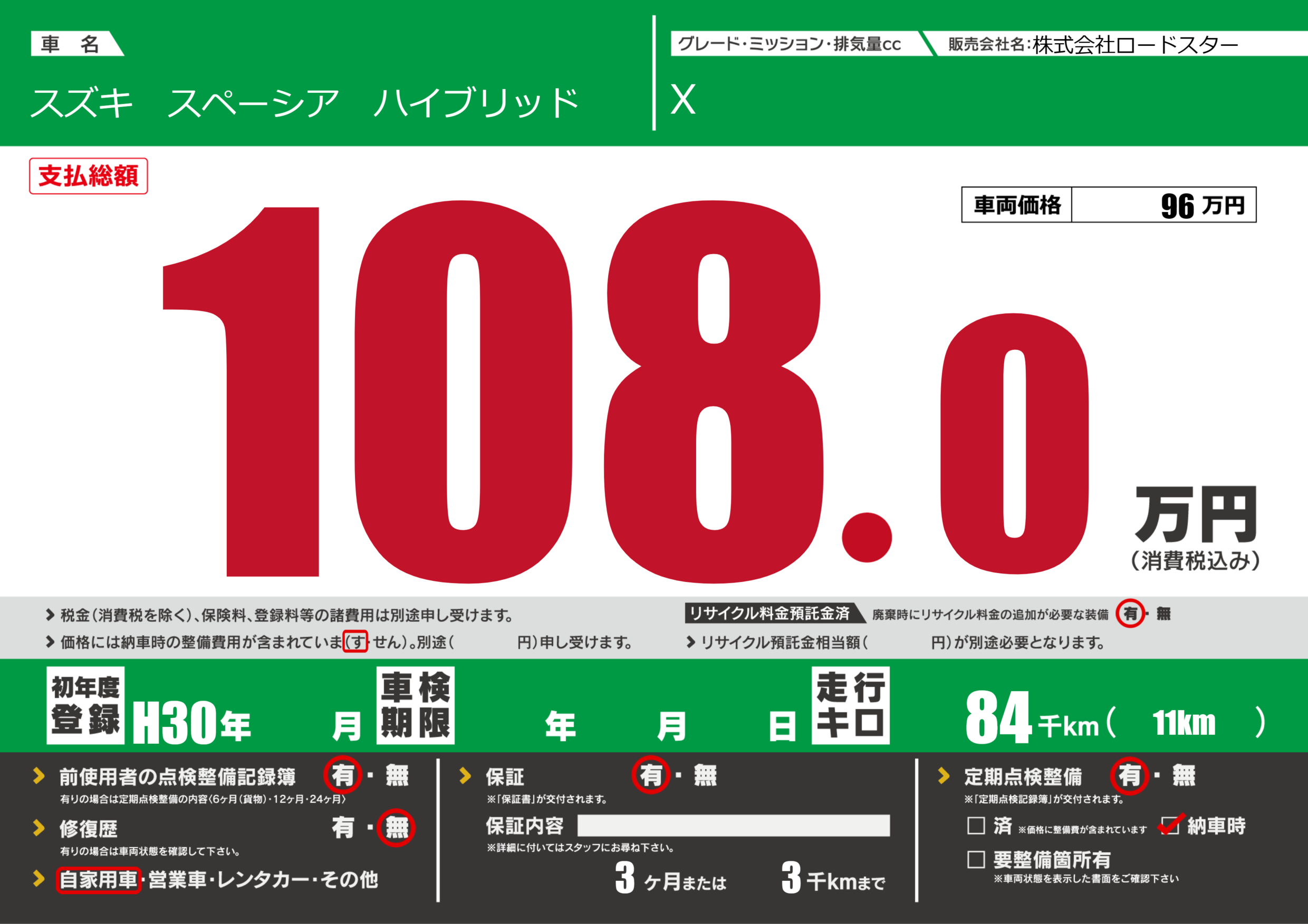 | 定期点検整備 | 定期点検整備あり 納車時あり | ||