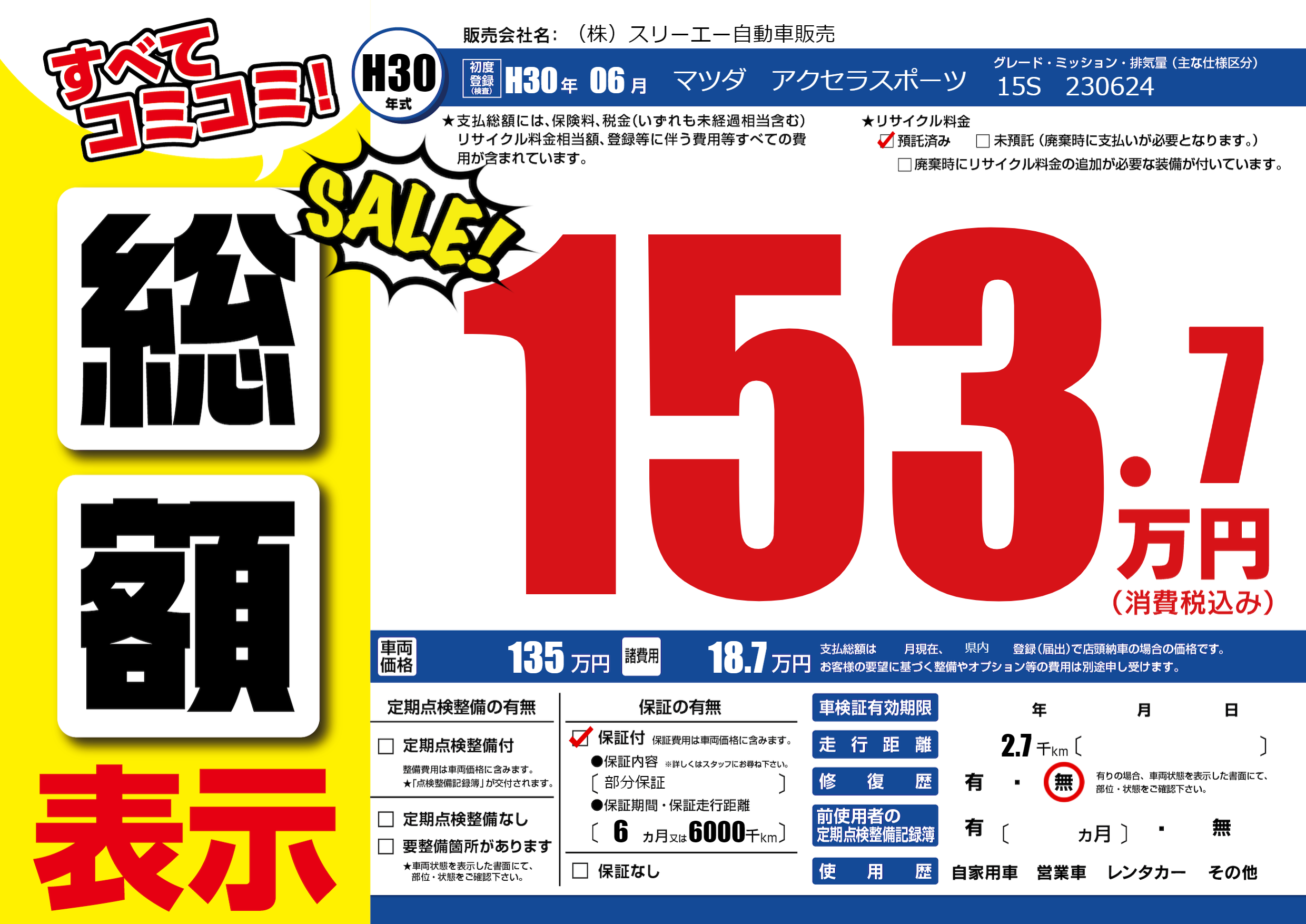 | 車名 | マツダ アクセラスポーツ | グレード ミッション 排気量 |