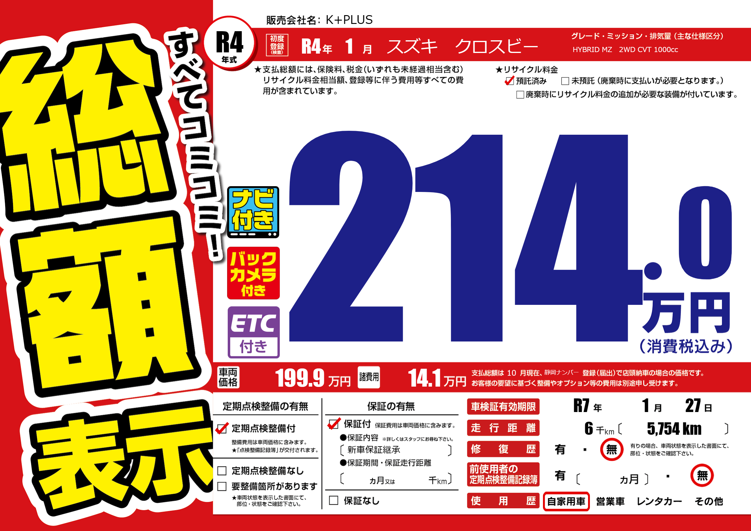 | 車名 | スズキ クロスビー | グレード ミッション 排気量 |
