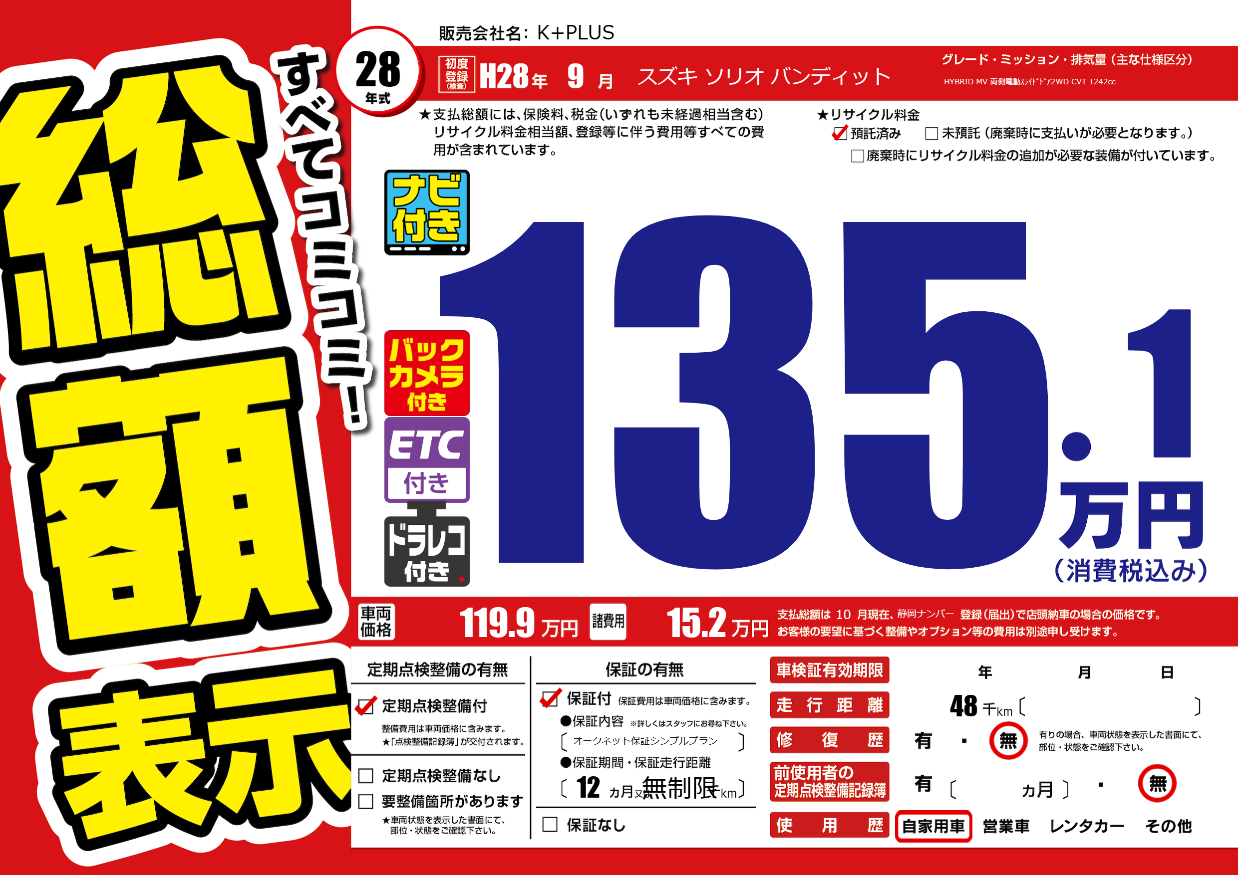 | 走行キロ | 4.8万km | 初年度登録 | H28年9月 |