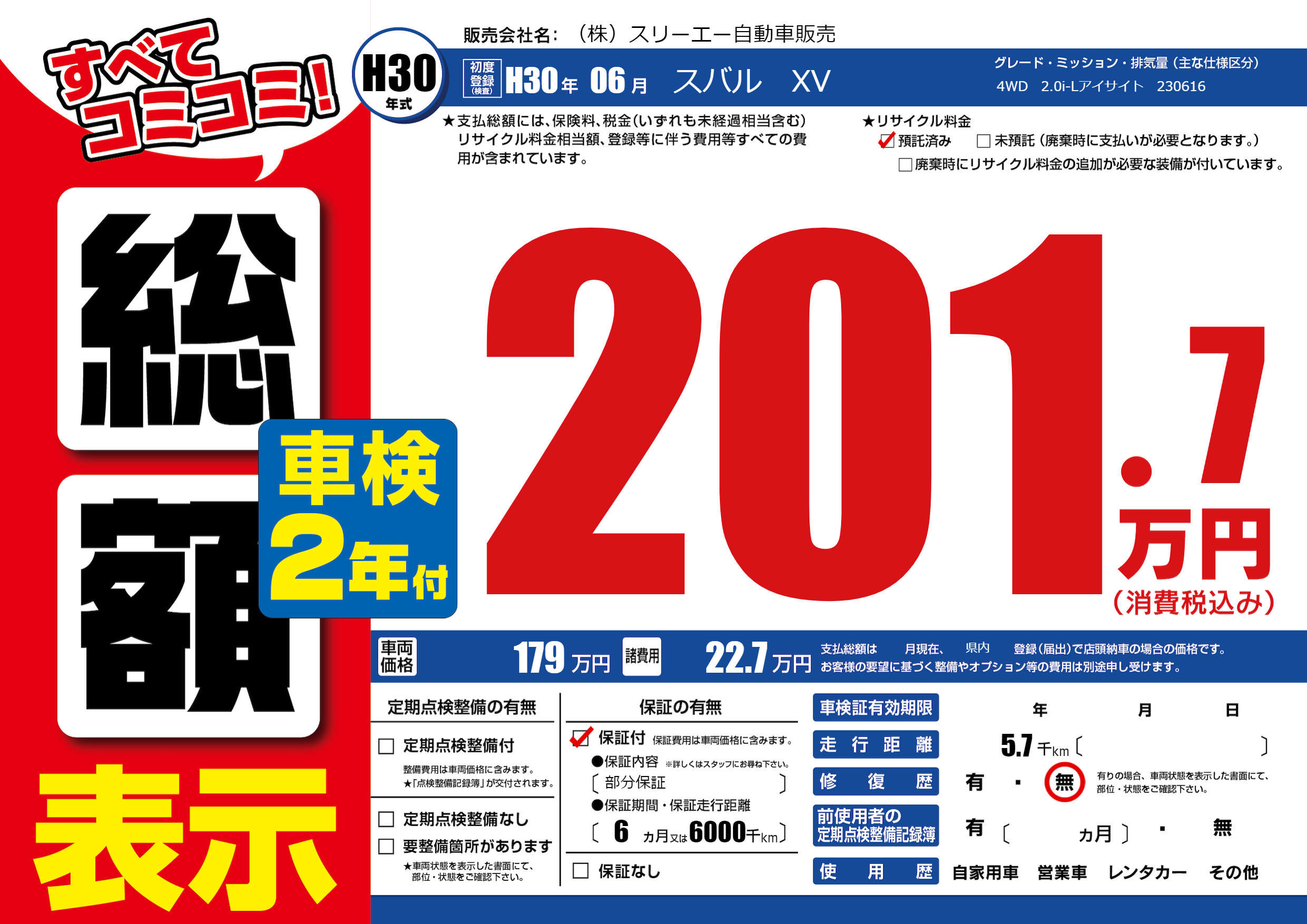 | 車名 | スバル XV | グレード ミッション 排気量 |