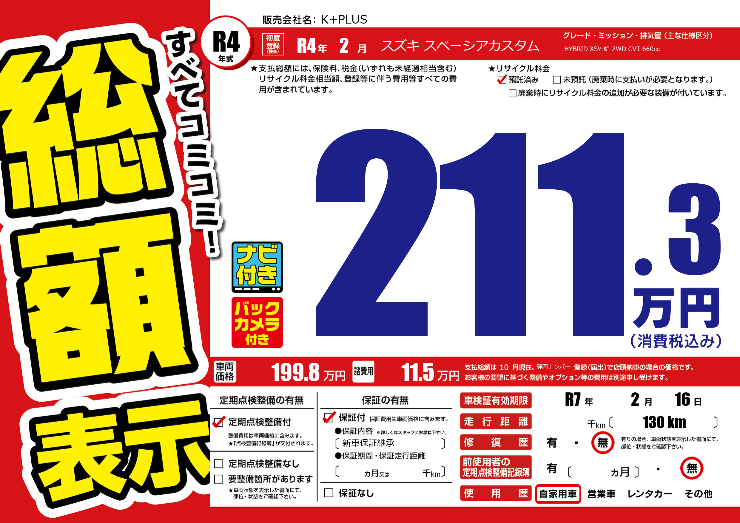 | 車名 | スズキ スペーシアカスタム | グレード ミッション 排気量 |
