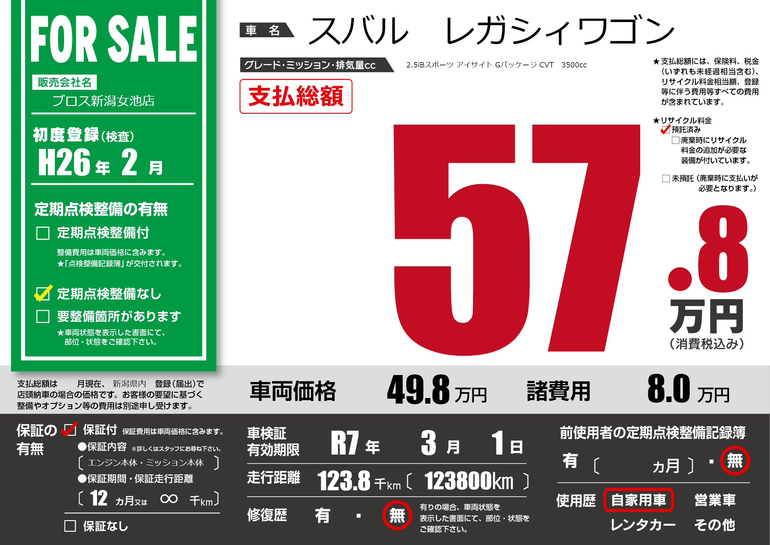 | 車名 | スバル レガシィワゴン | グレード ミッション 排気量 |