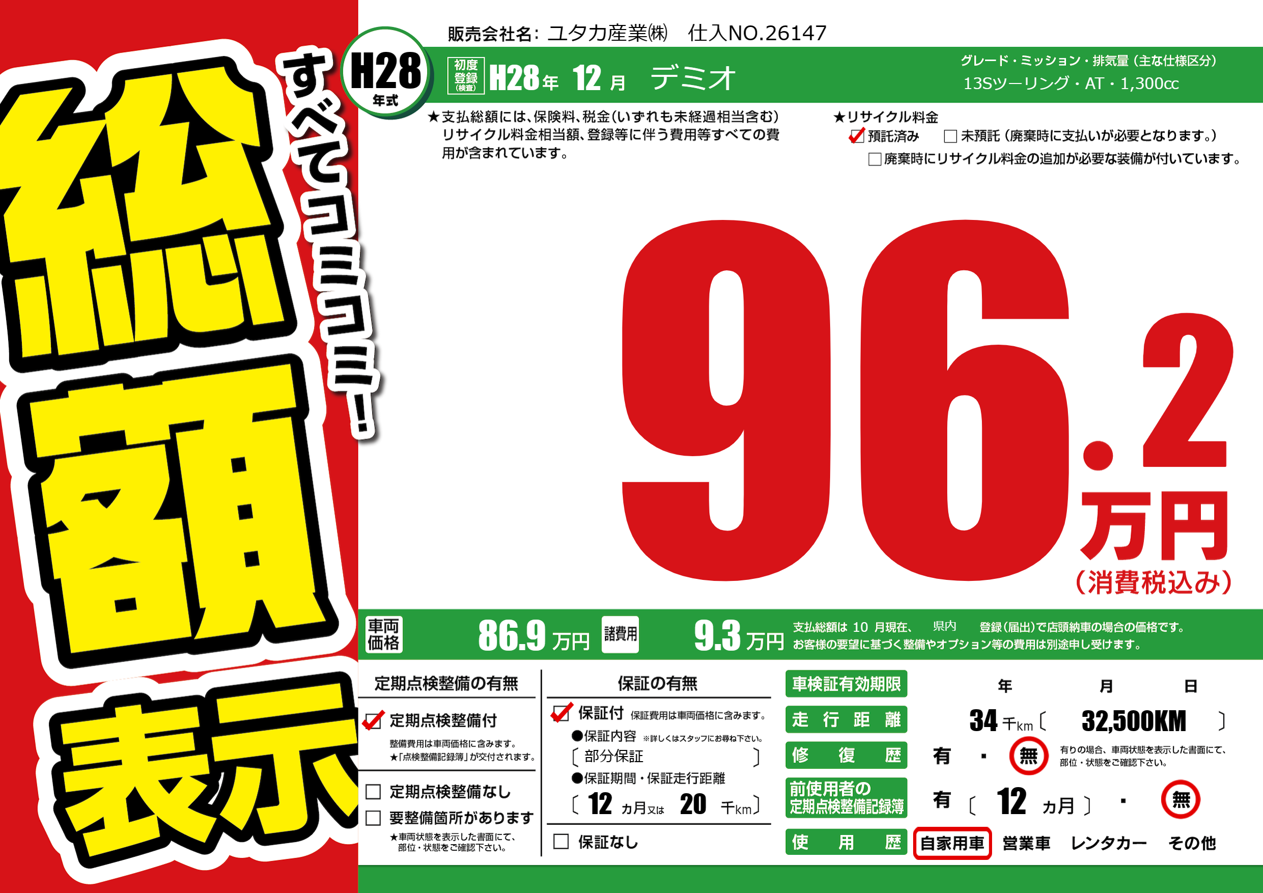 保証付き 保証内容(部分保証) 12ヶ月または(20)千kmまで |