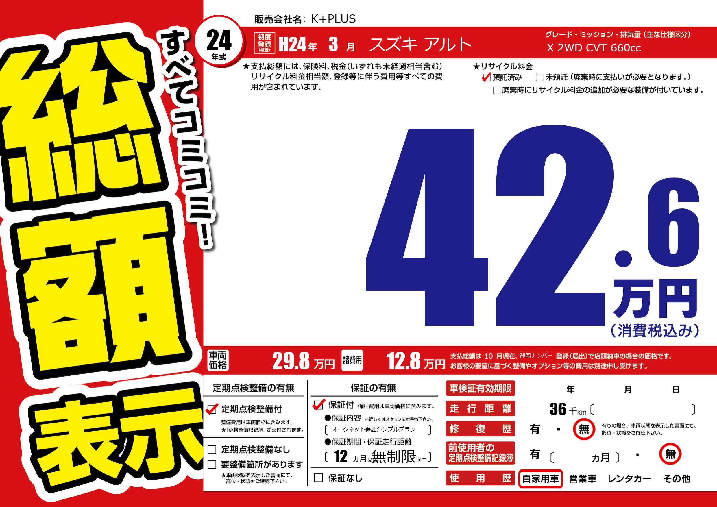 | 車名 | スズキ アルト | グレード ミッション 排気量 |