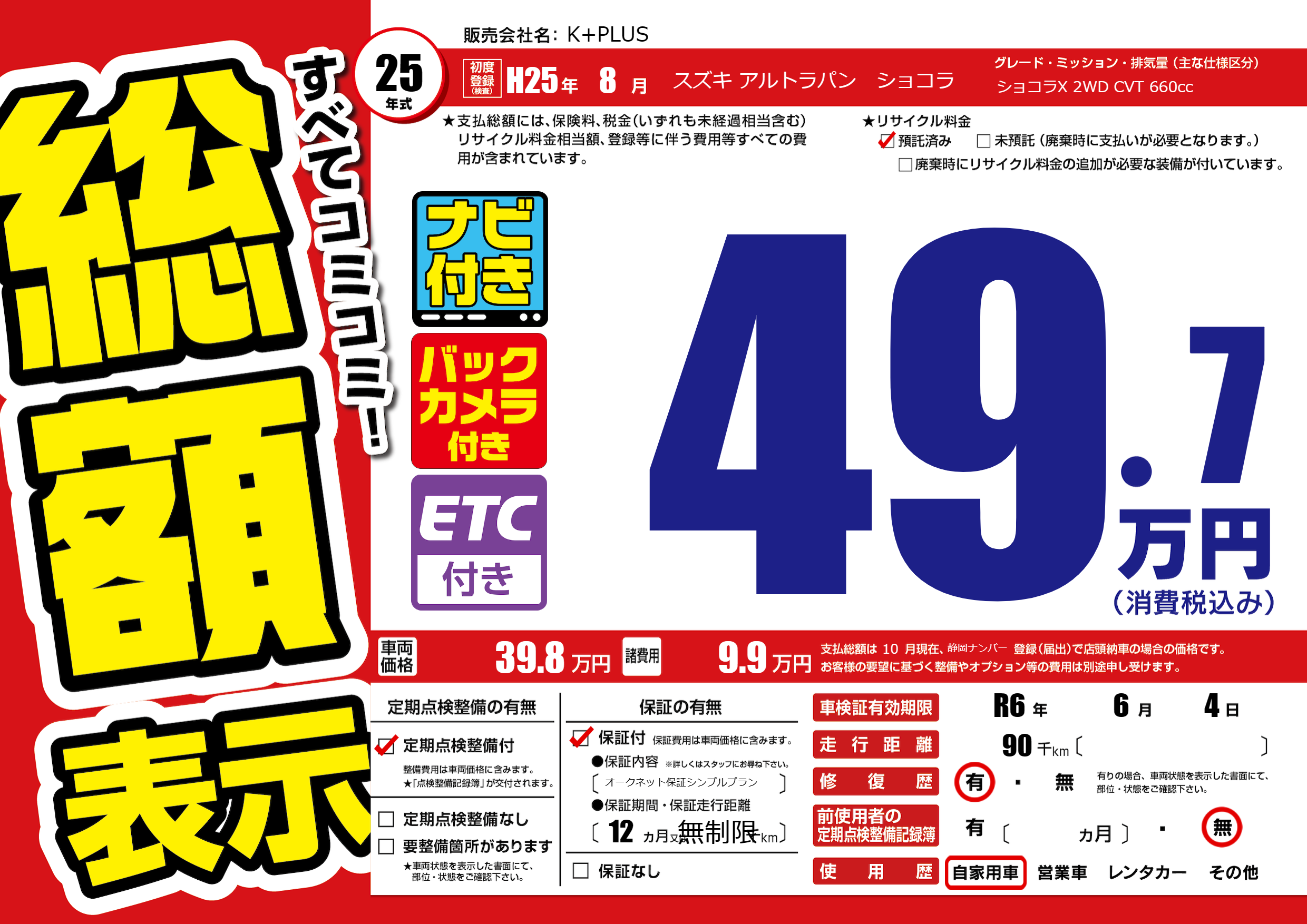 | 走行キロ | 9万km | 初年度登録 | H25年8月 |