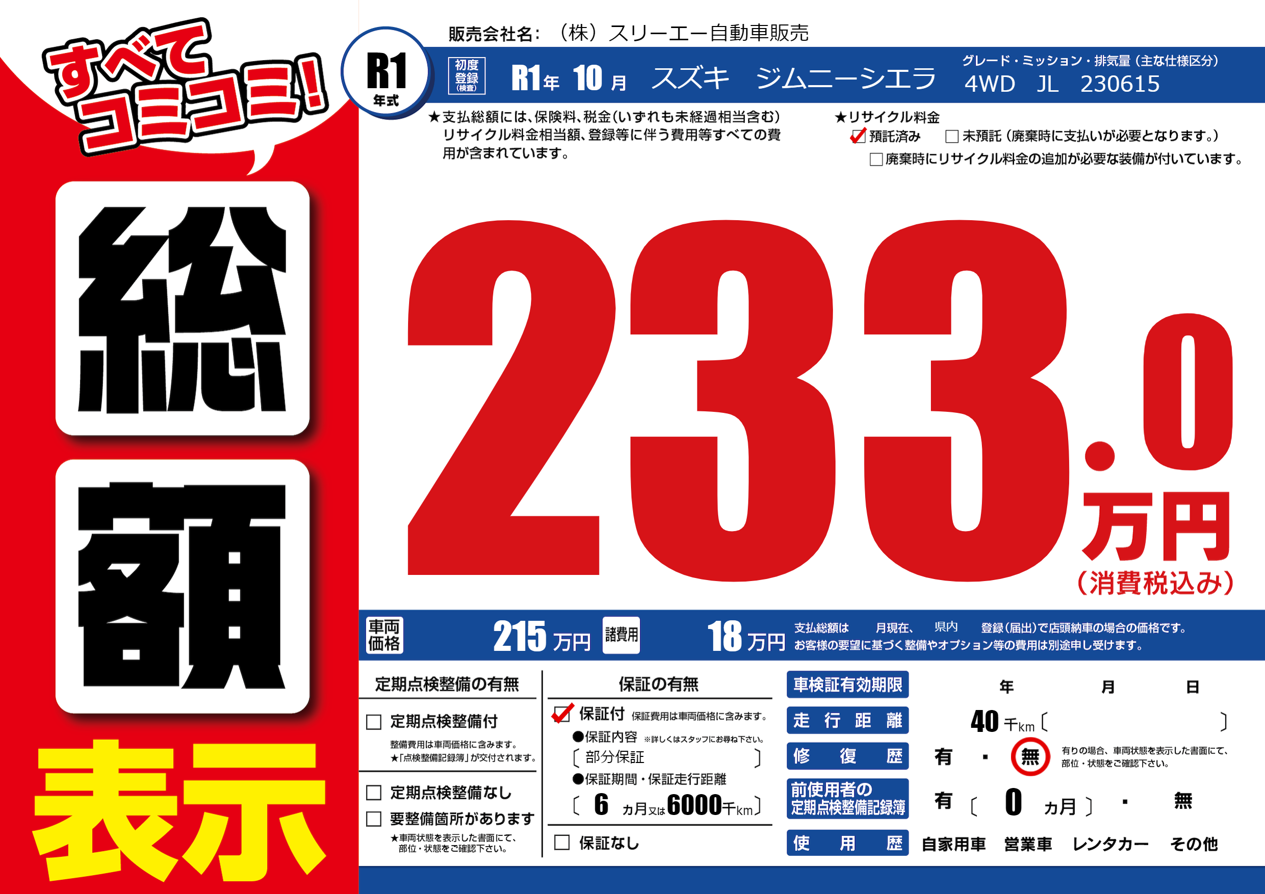 | 車名 | スズキ ジムニーシエラ | グレード ミッション 排気量 |