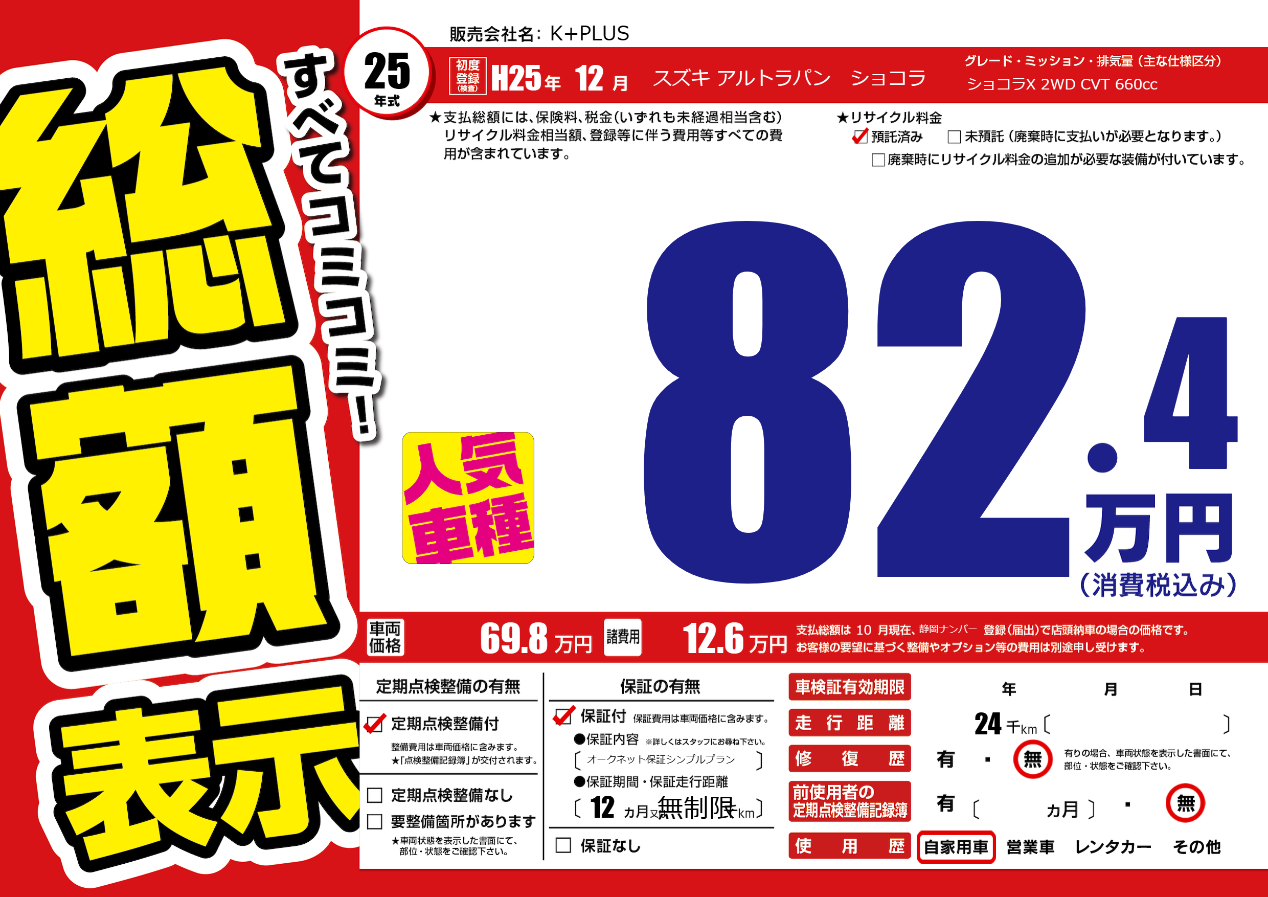 | 走行キロ | 2.4万km | 初年度登録 | H25年12月 |