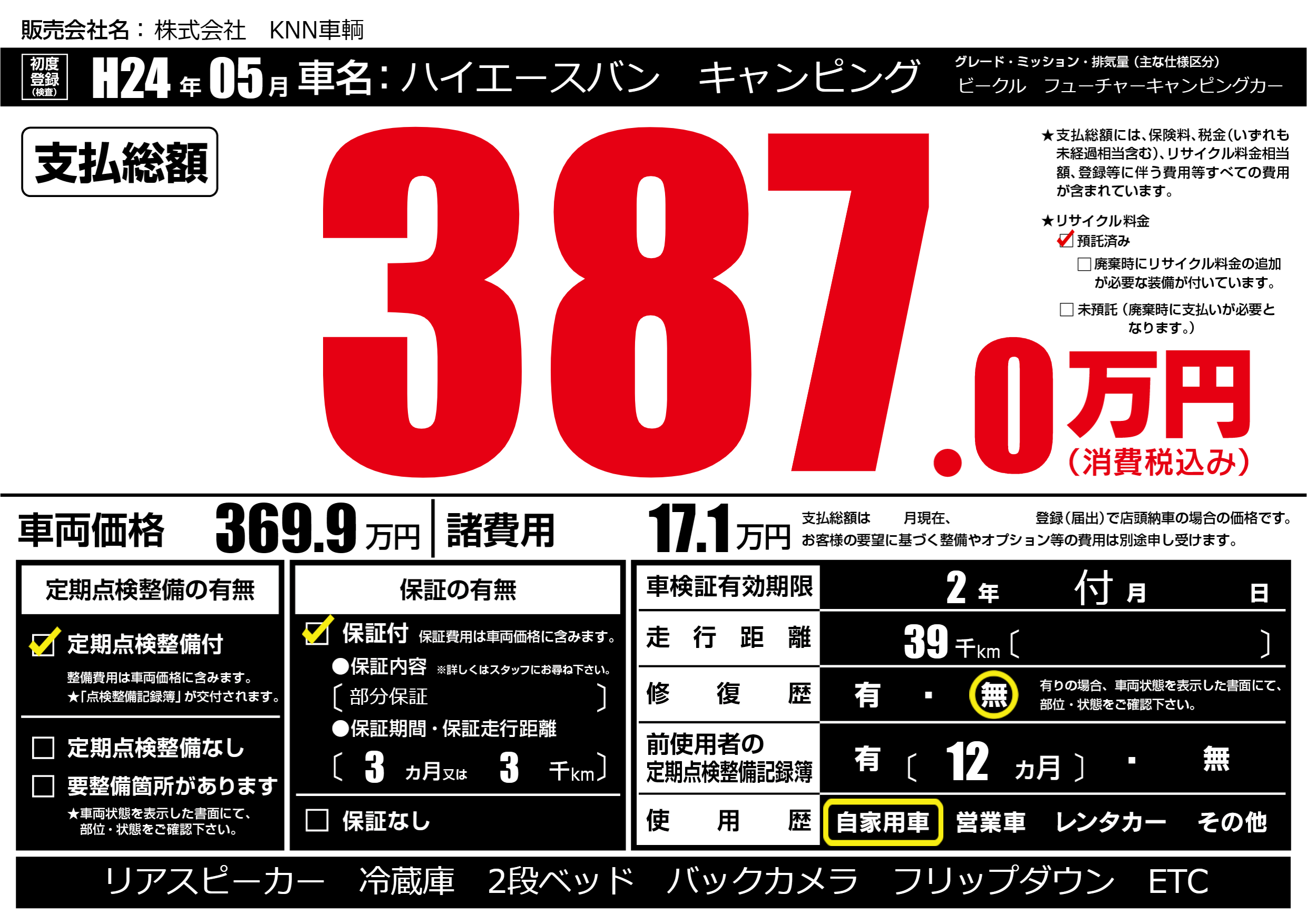 | 走行キロ | 3.9万km | 初年度登録 | H24年05月 |