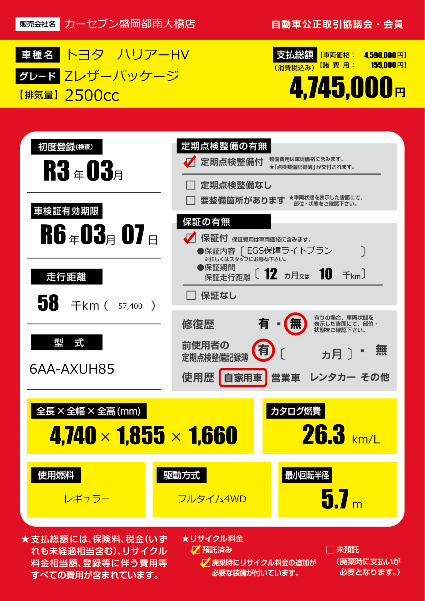 | 走行キロ | 5.8万km | 初年度登録 | R3年03月 |