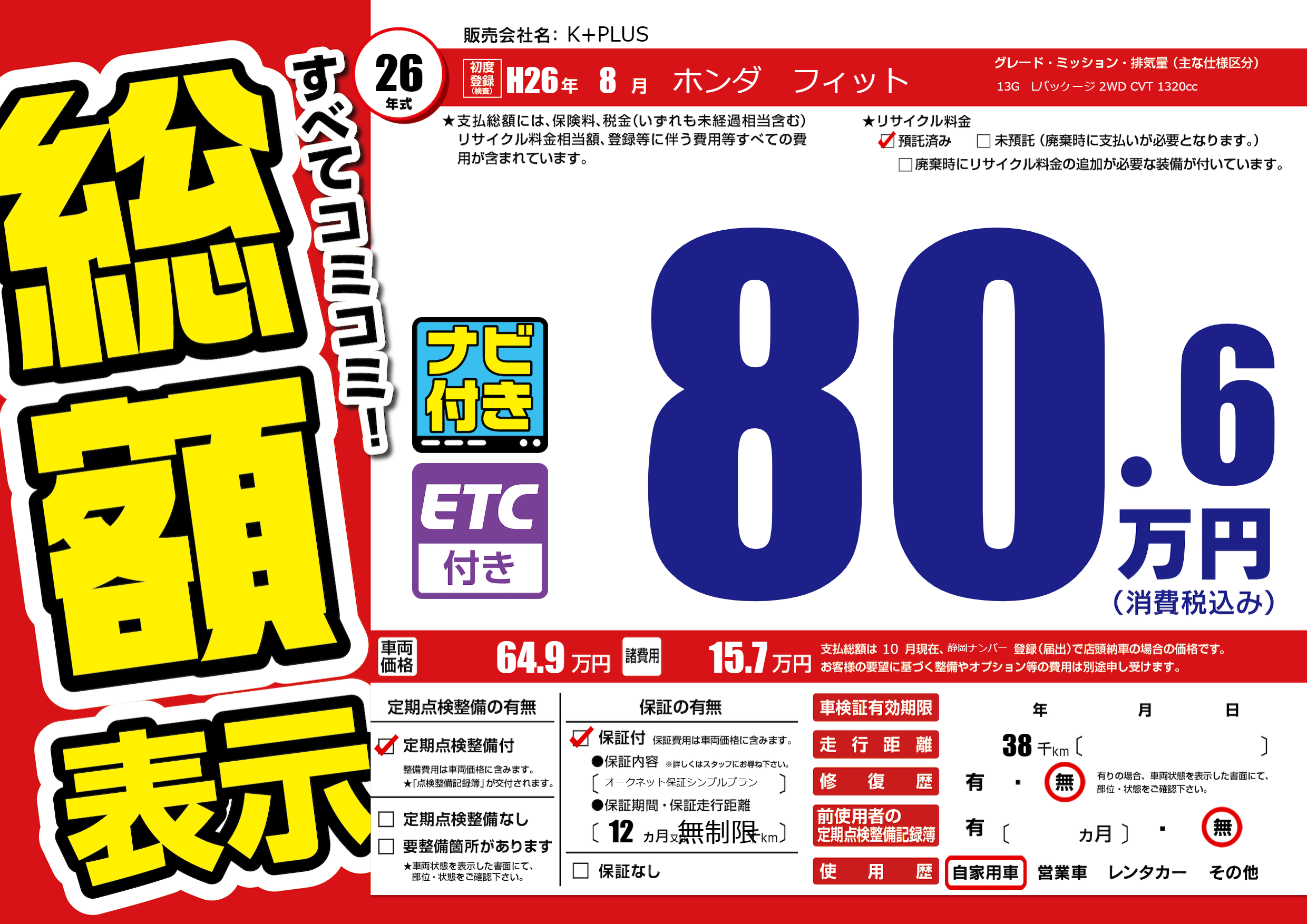 | 走行キロ | 3.8万km | 初年度登録 | H26年8月 |