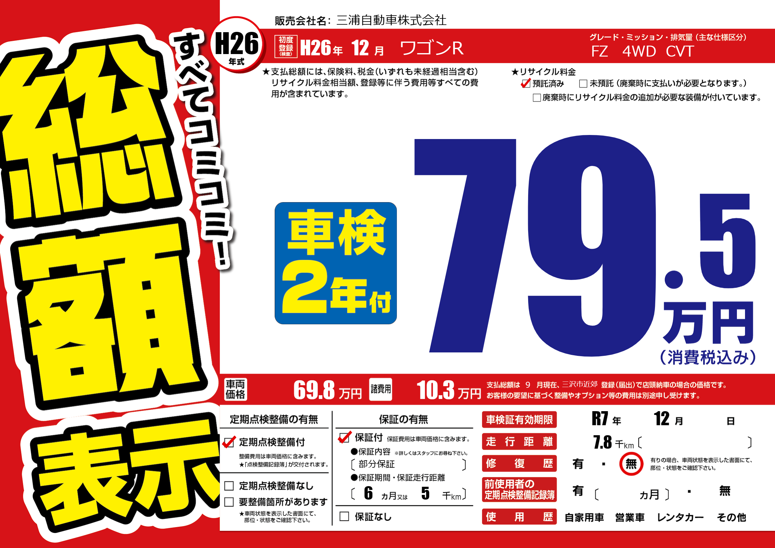 | 車名 | ワゴンR | グレード ミッション 排気量 |