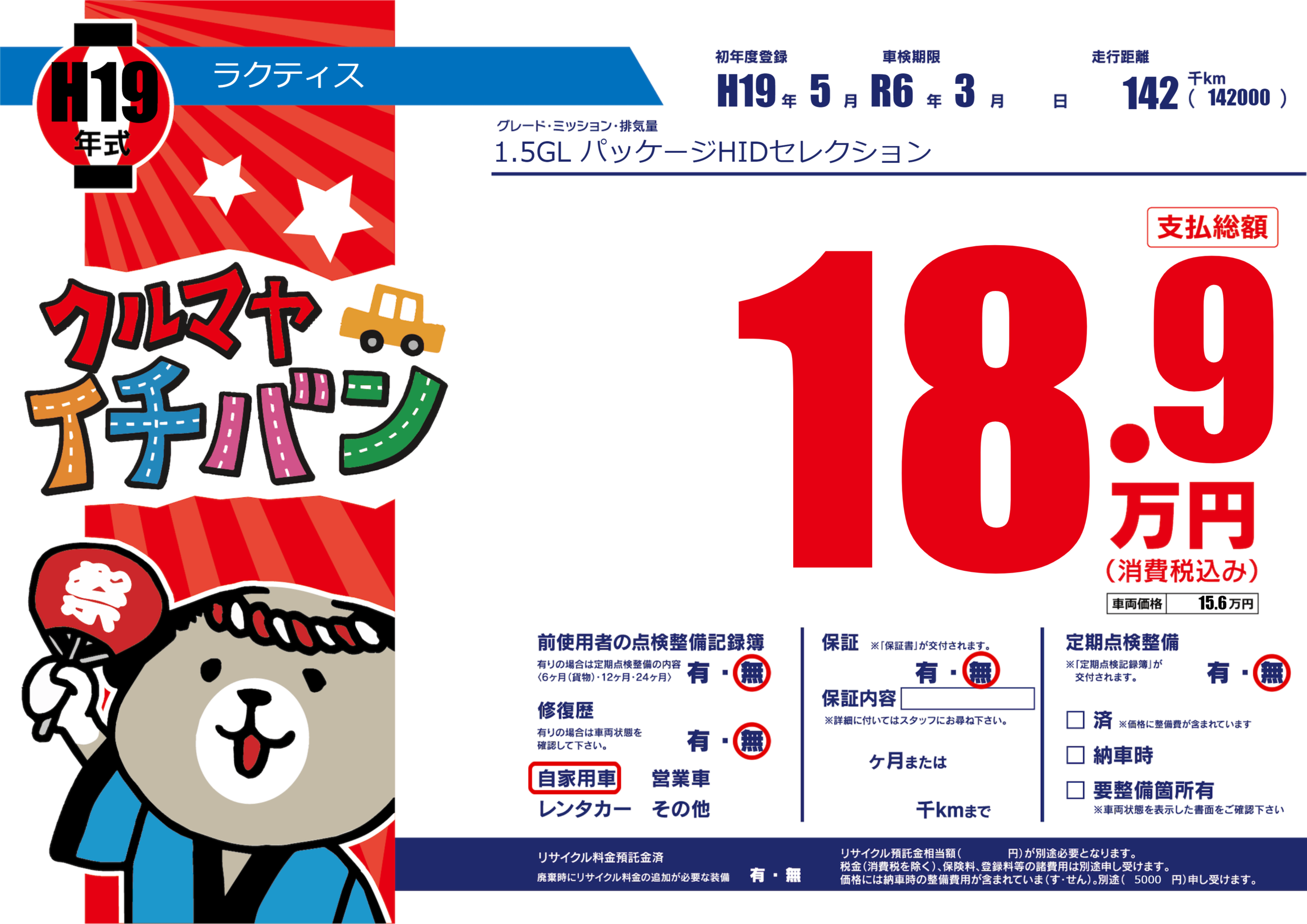 | 車名 | ラクティス | グレード ミッション 排気量 |