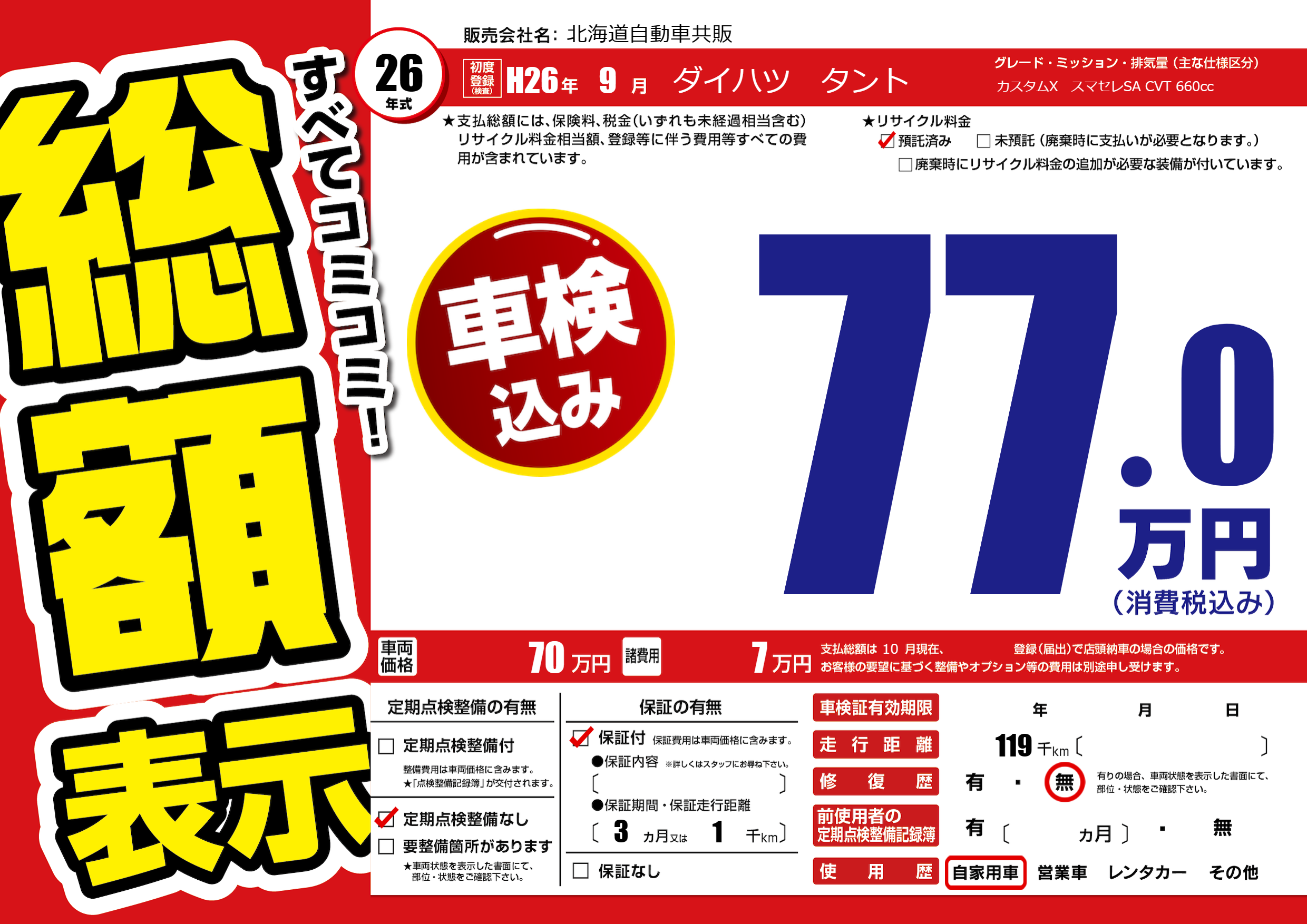 | 車名 | ダイハツ タント | グレード ミッション 排気量 |