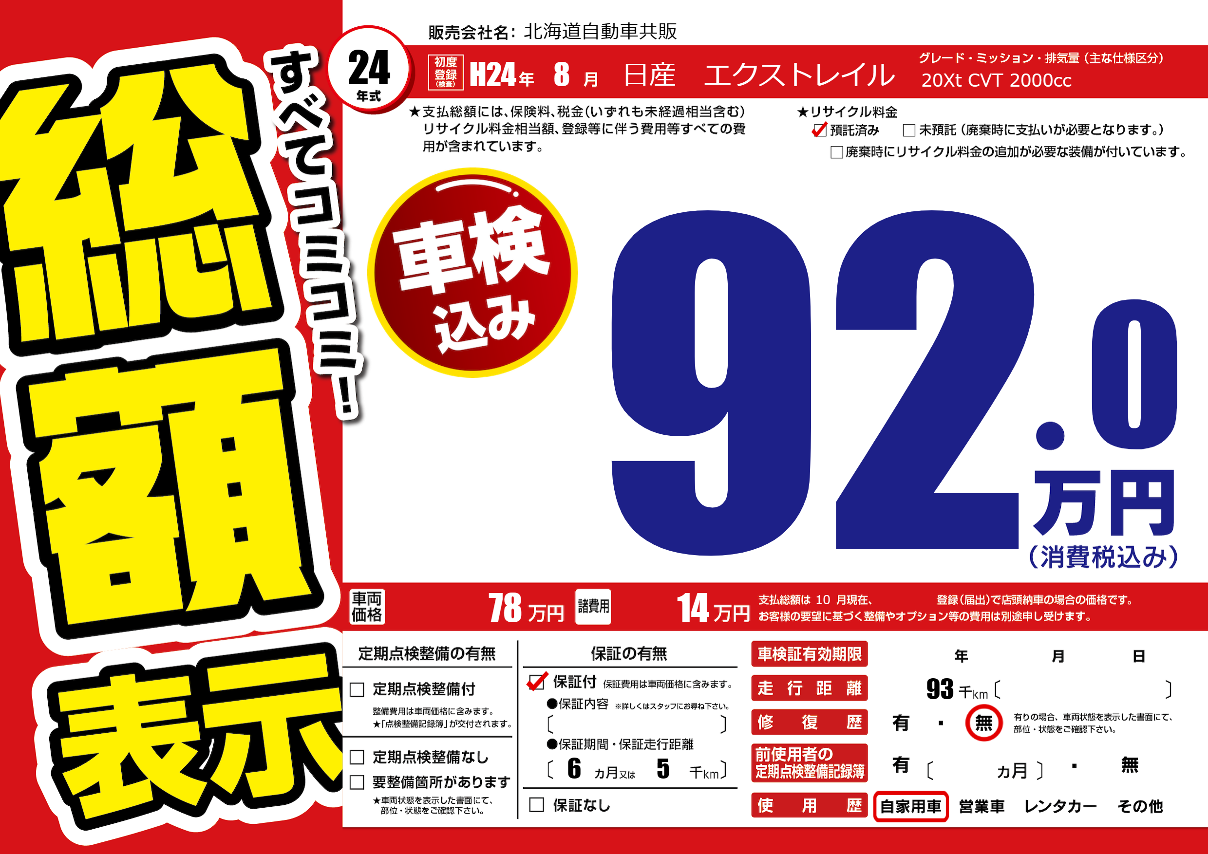 | 走行キロ | 9.3万km | 初年度登録 | H24年8月 |