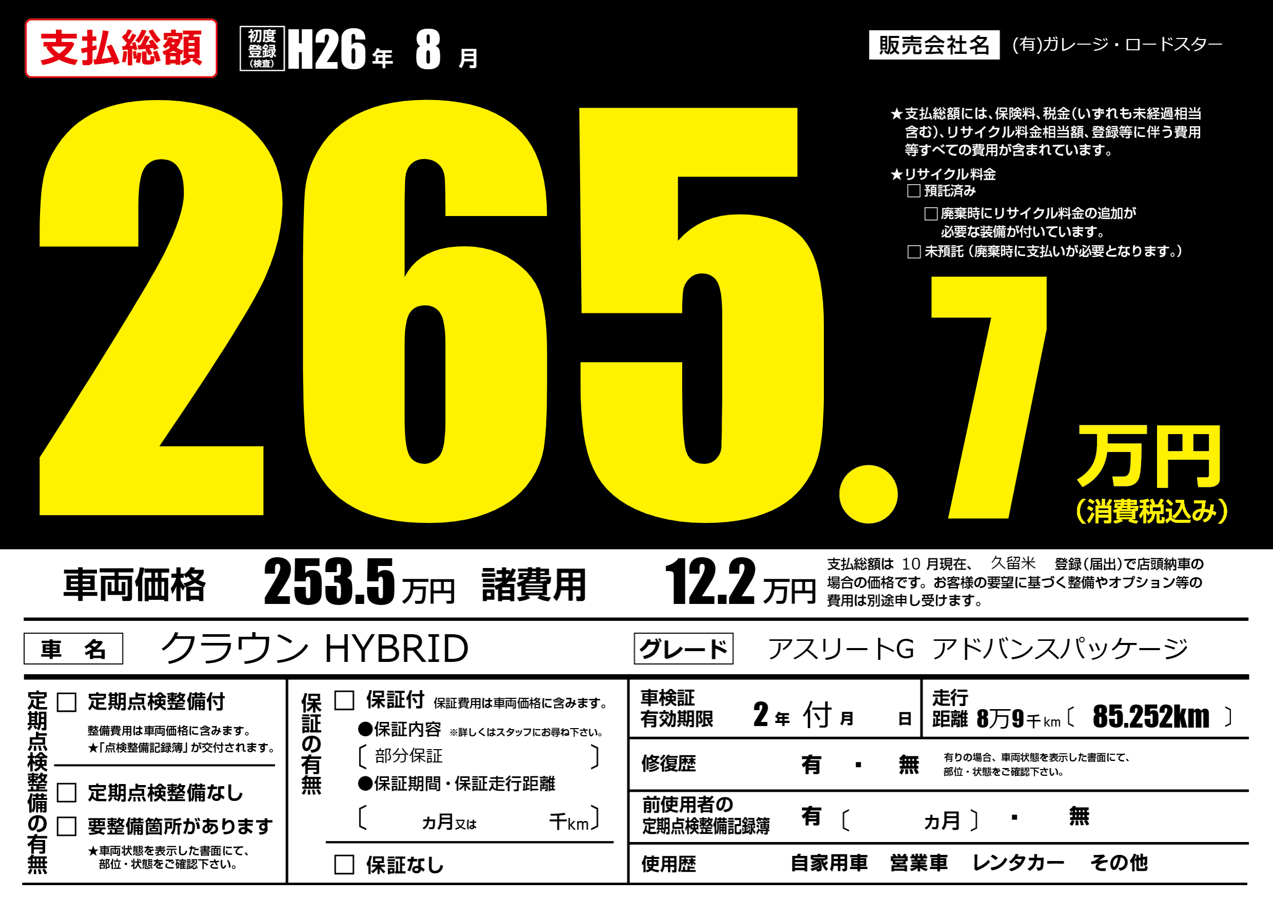 | 車名 | クラウン HYBRID | グレード ミッション 排気量 |