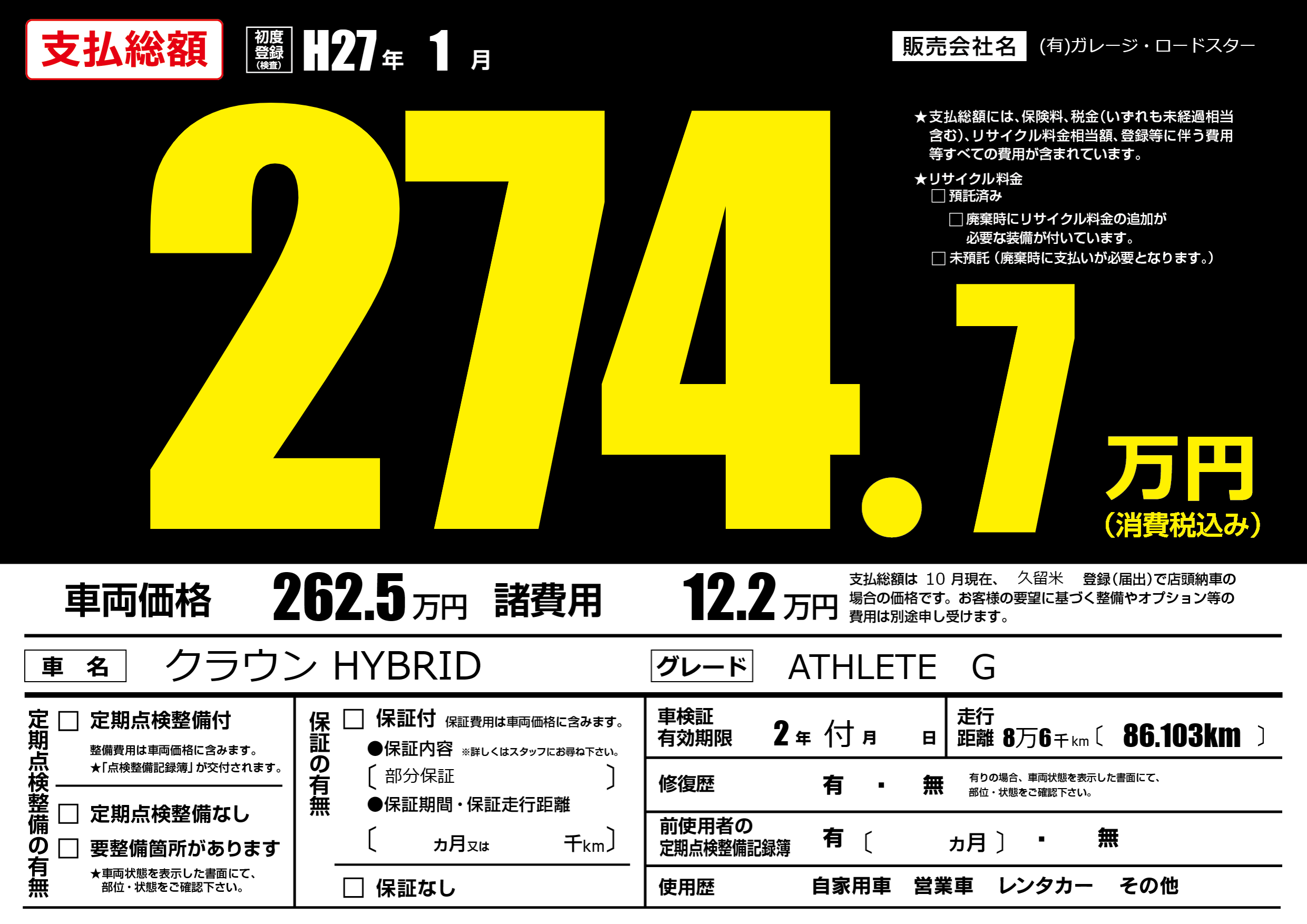 | 車名 | クラウン HYBRID | グレード ミッション 排気量 |