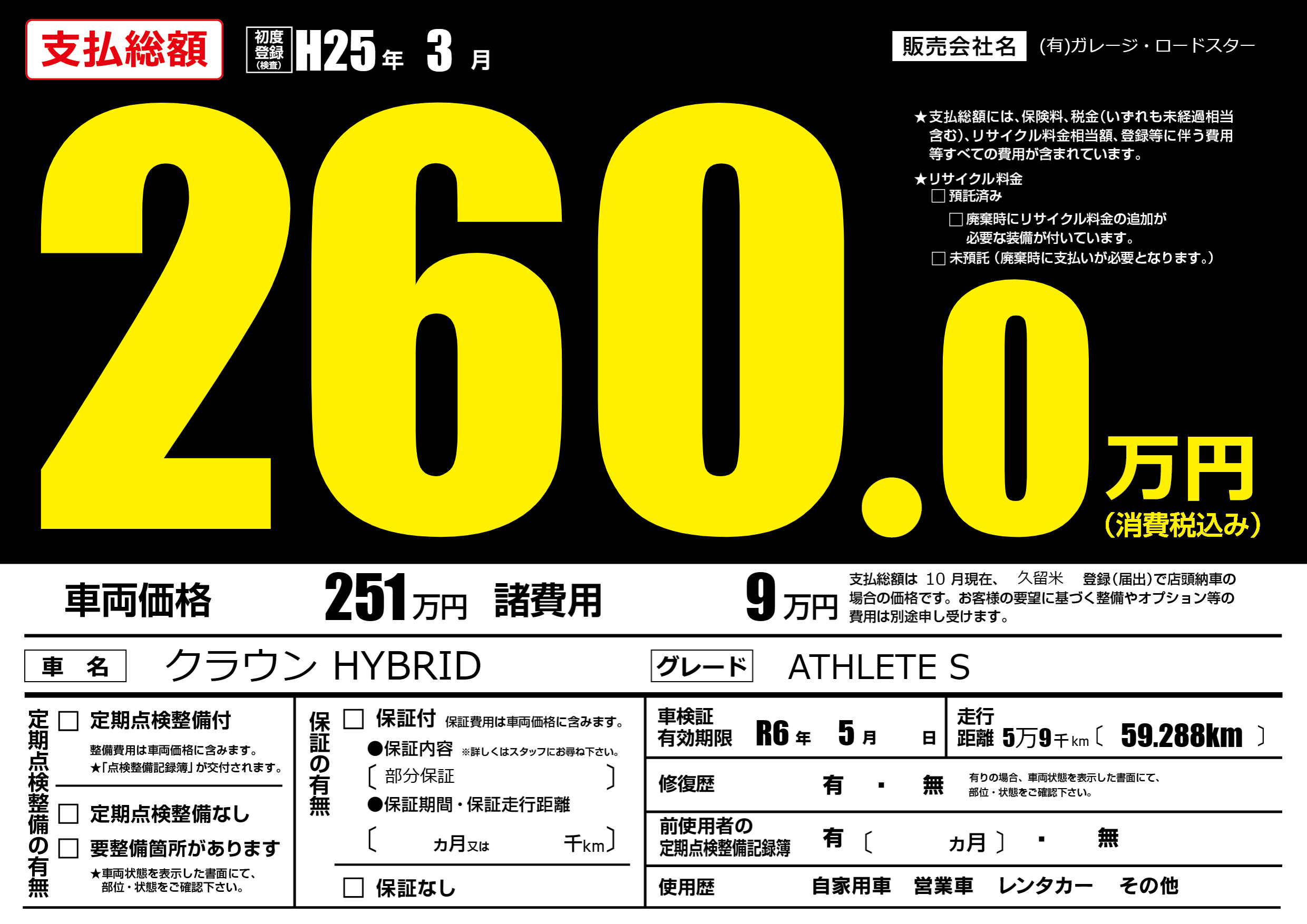 | 車名 | クラウン HYBRID | グレード ミッション 排気量 |