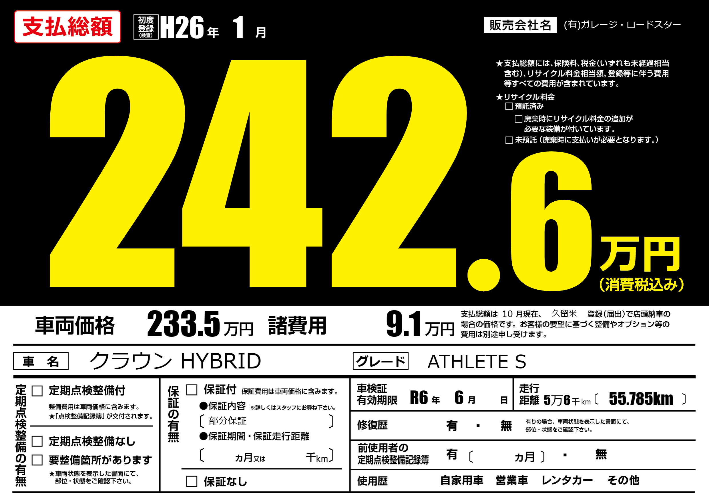 | 車名 | クラウン HYBRID | グレード ミッション 排気量 |