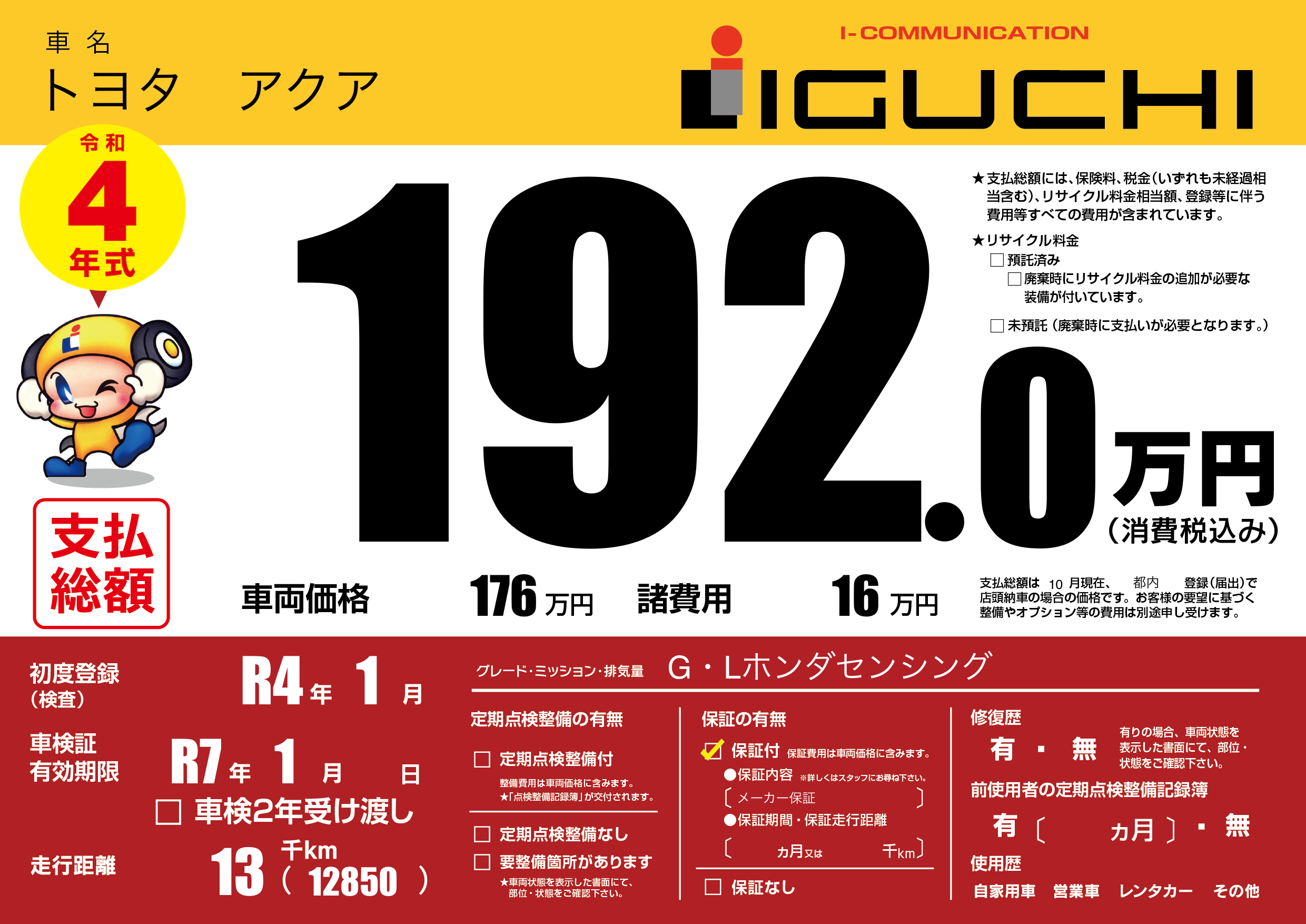 | 車名 | トヨタ アクア | グレード ミッション 排気量 |