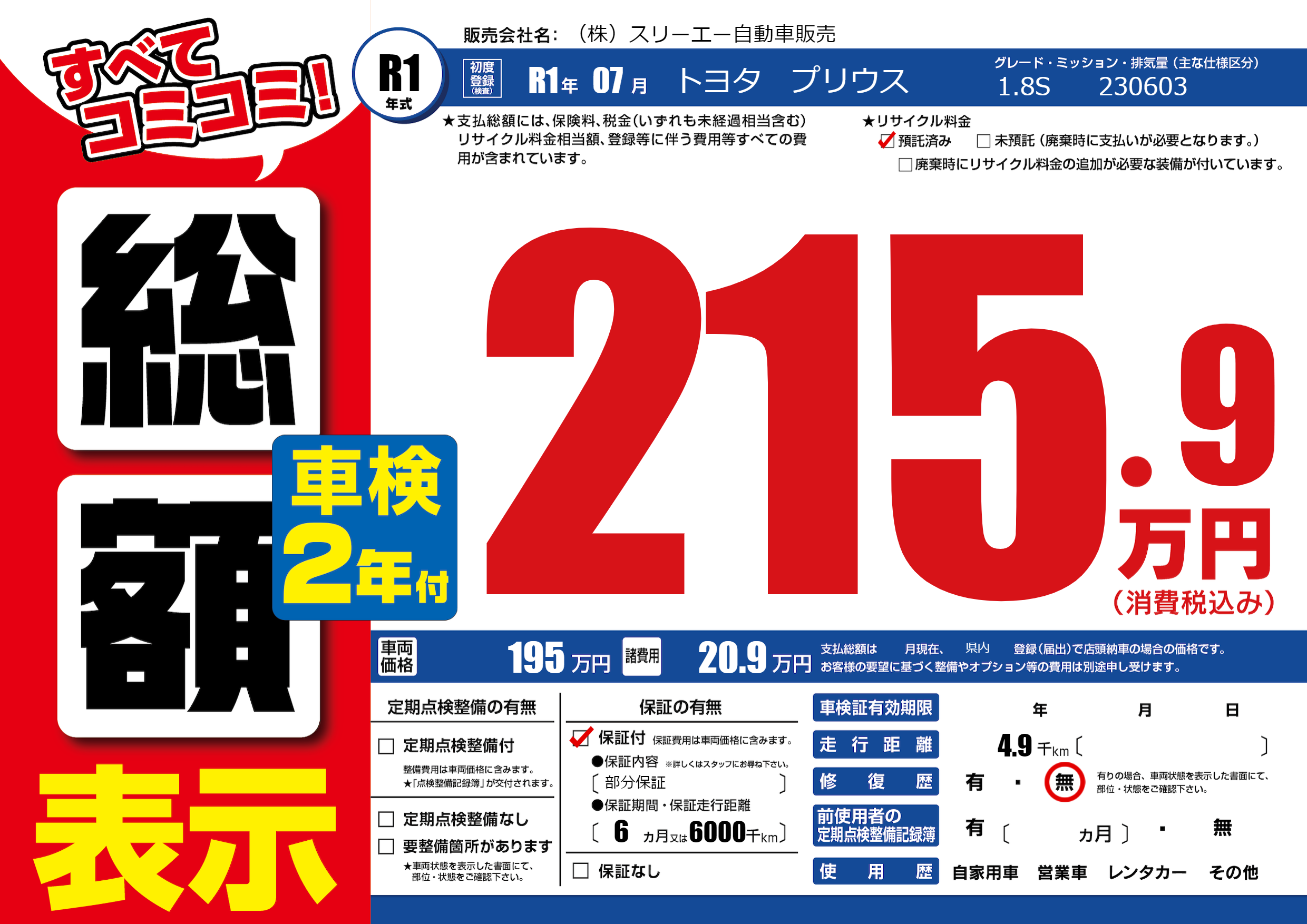 | 車名 | トヨタ プリウス | グレード ミッション 排気量 |