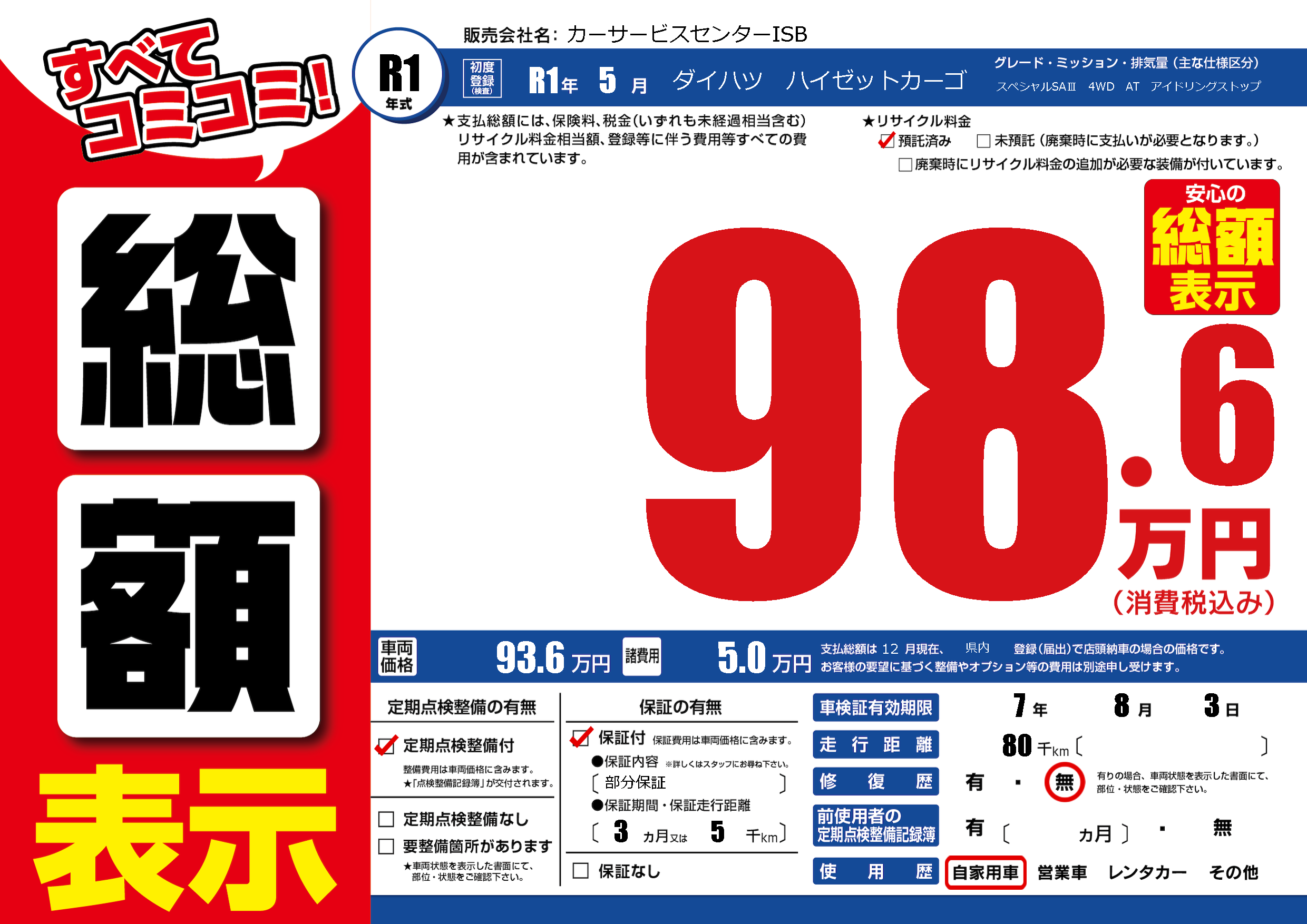 保証付き 保証内容(部分保証) 3ヶ月または(5)千kmまで |