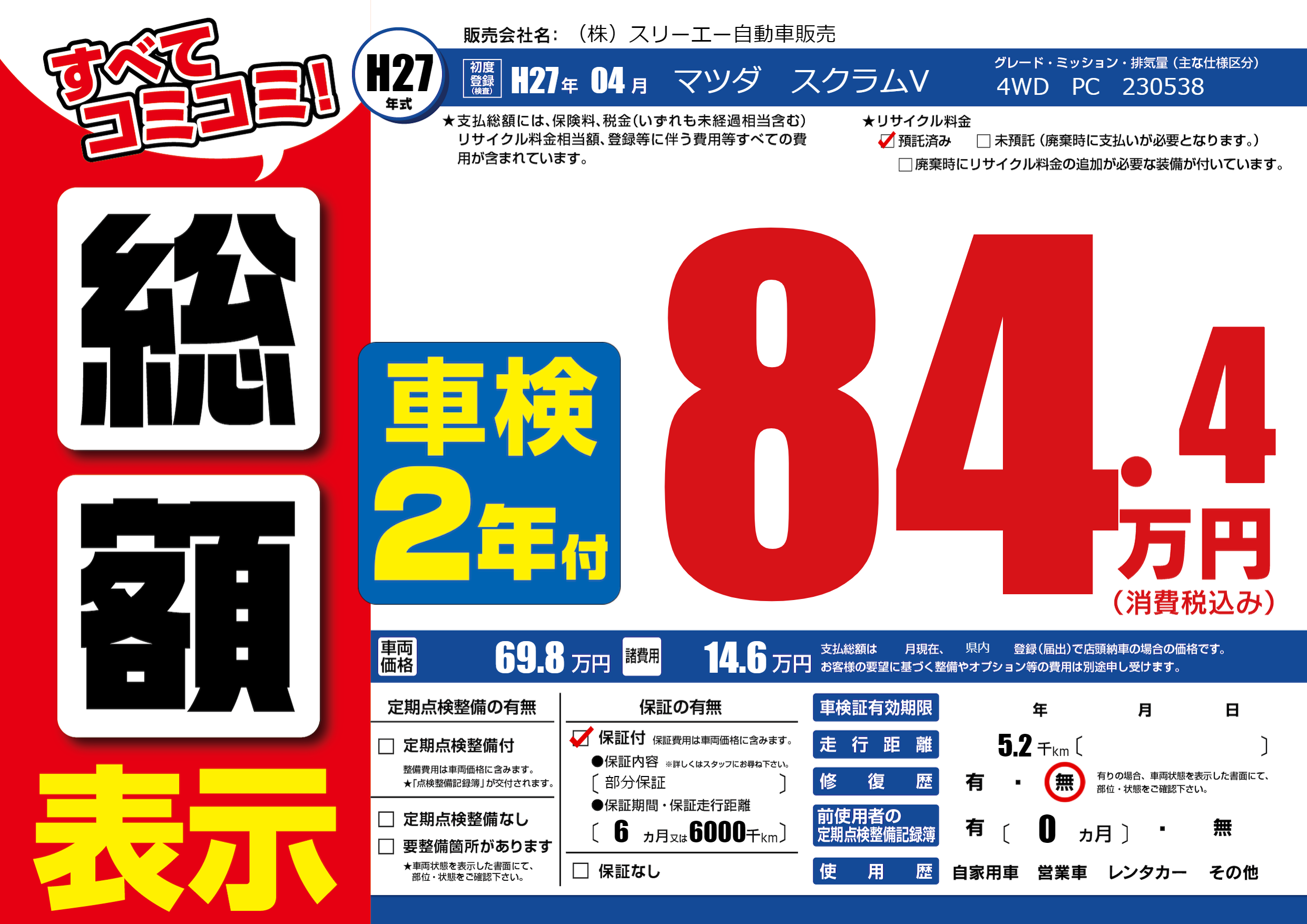 | 車名 | マツダ スクラムV | グレード ミッション 排気量 |