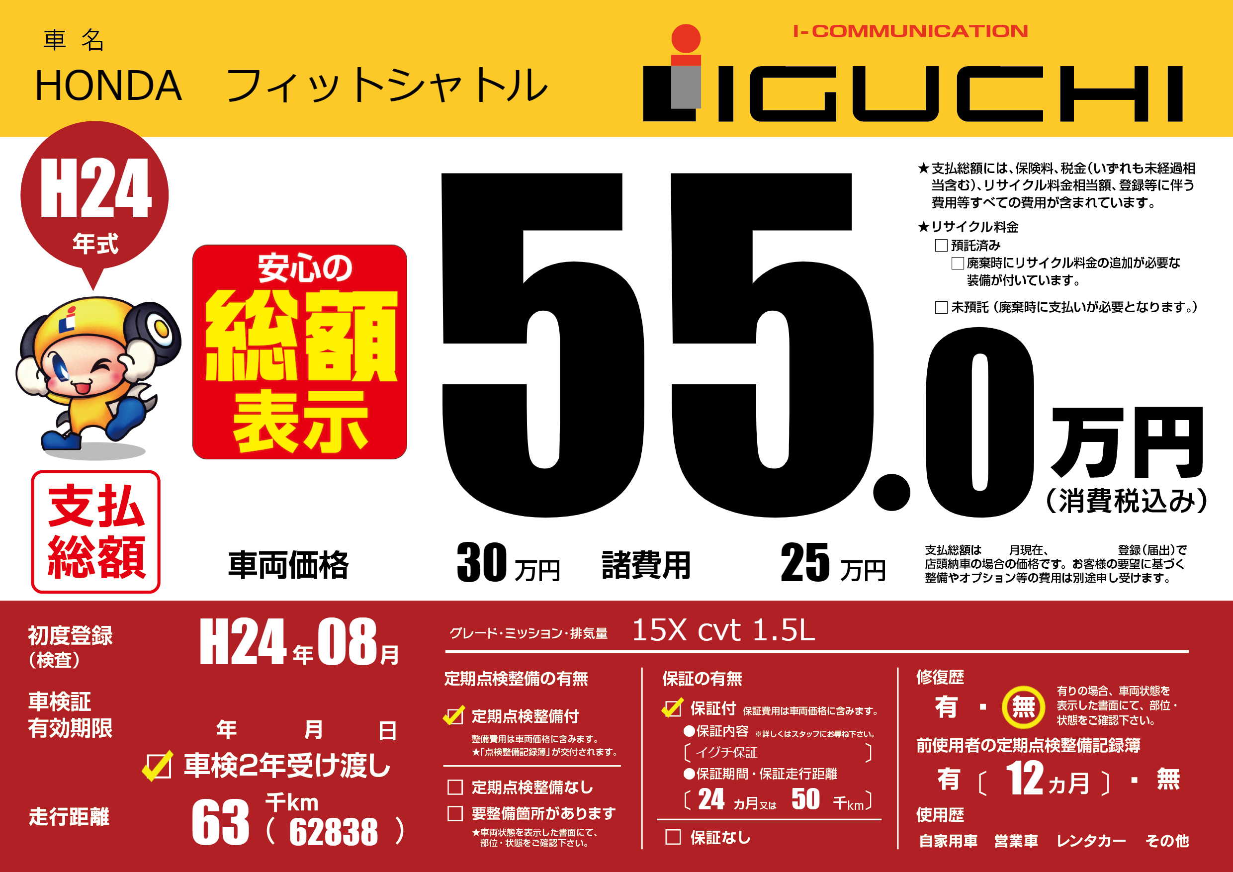| 走行キロ | 6.3万km | 初年度登録 | H24年08月 |