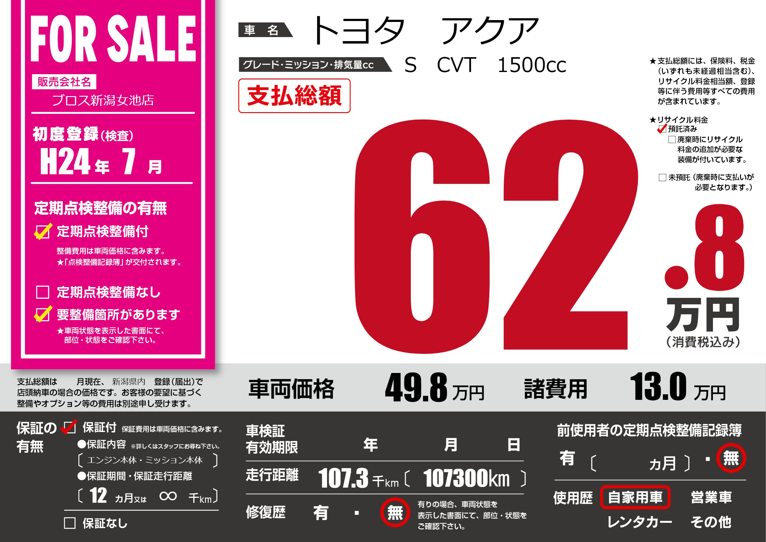 | 走行キロ | 10.7万km | 初年度登録 | H24年7月 |