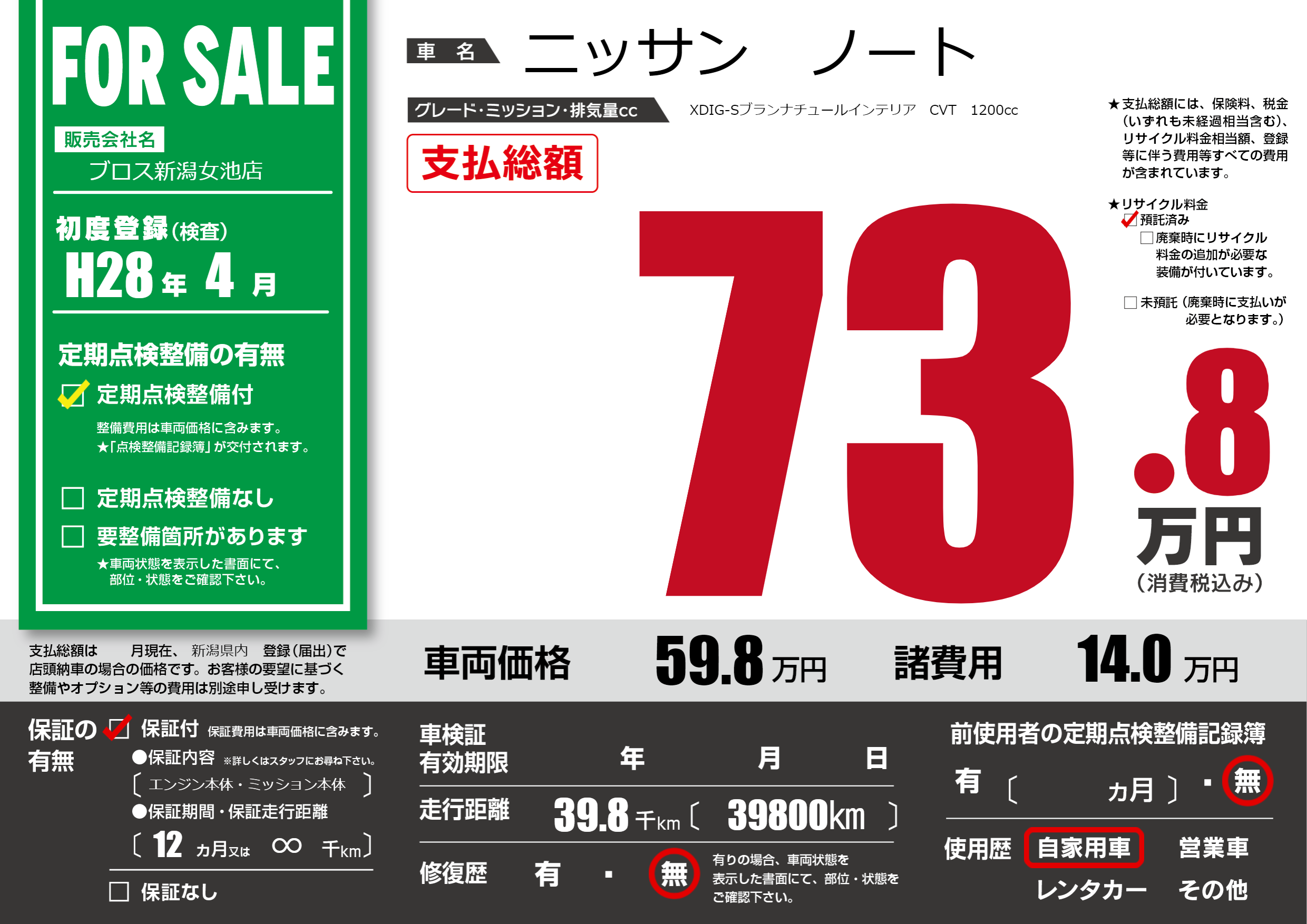 | 車名 | ニッサン ノート | グレード ミッション 排気量 |