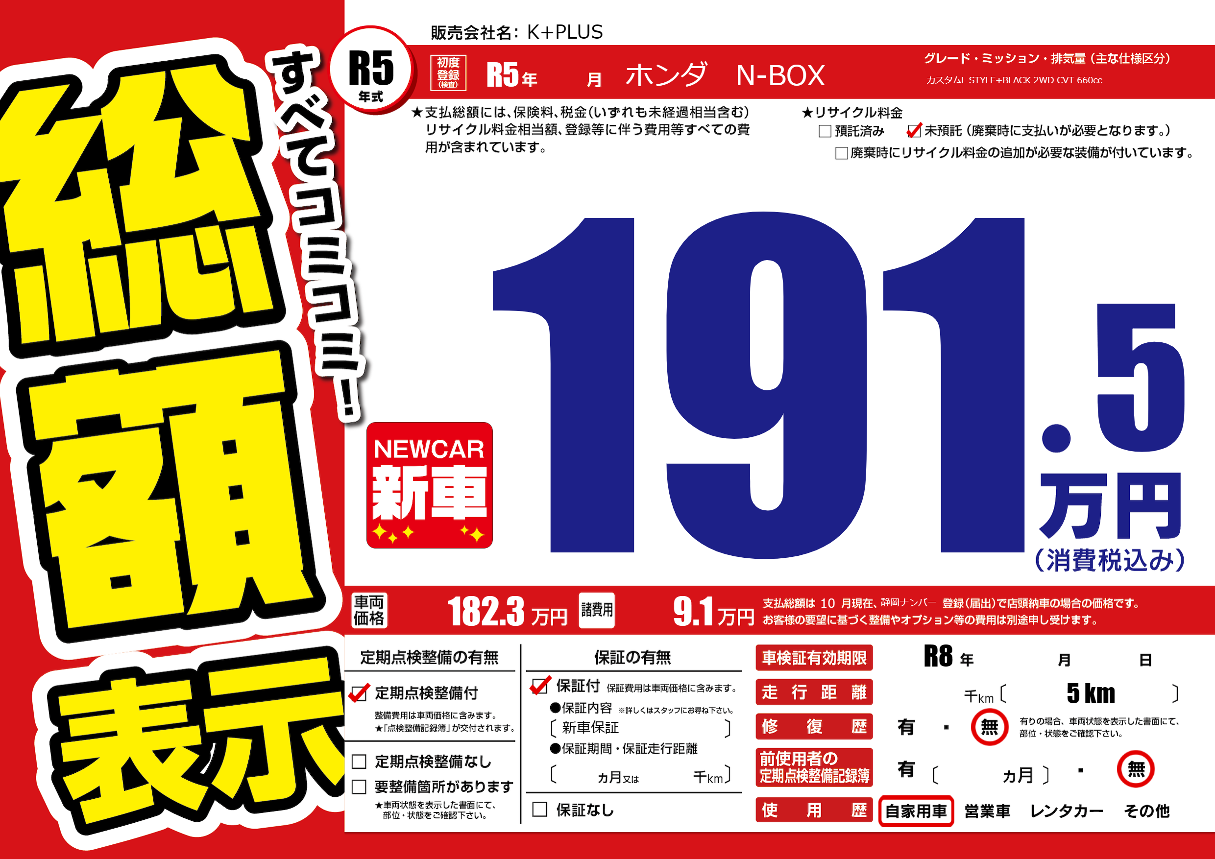 | 車名 | ホンダ N-BOX | グレード ミッション 排気量 |