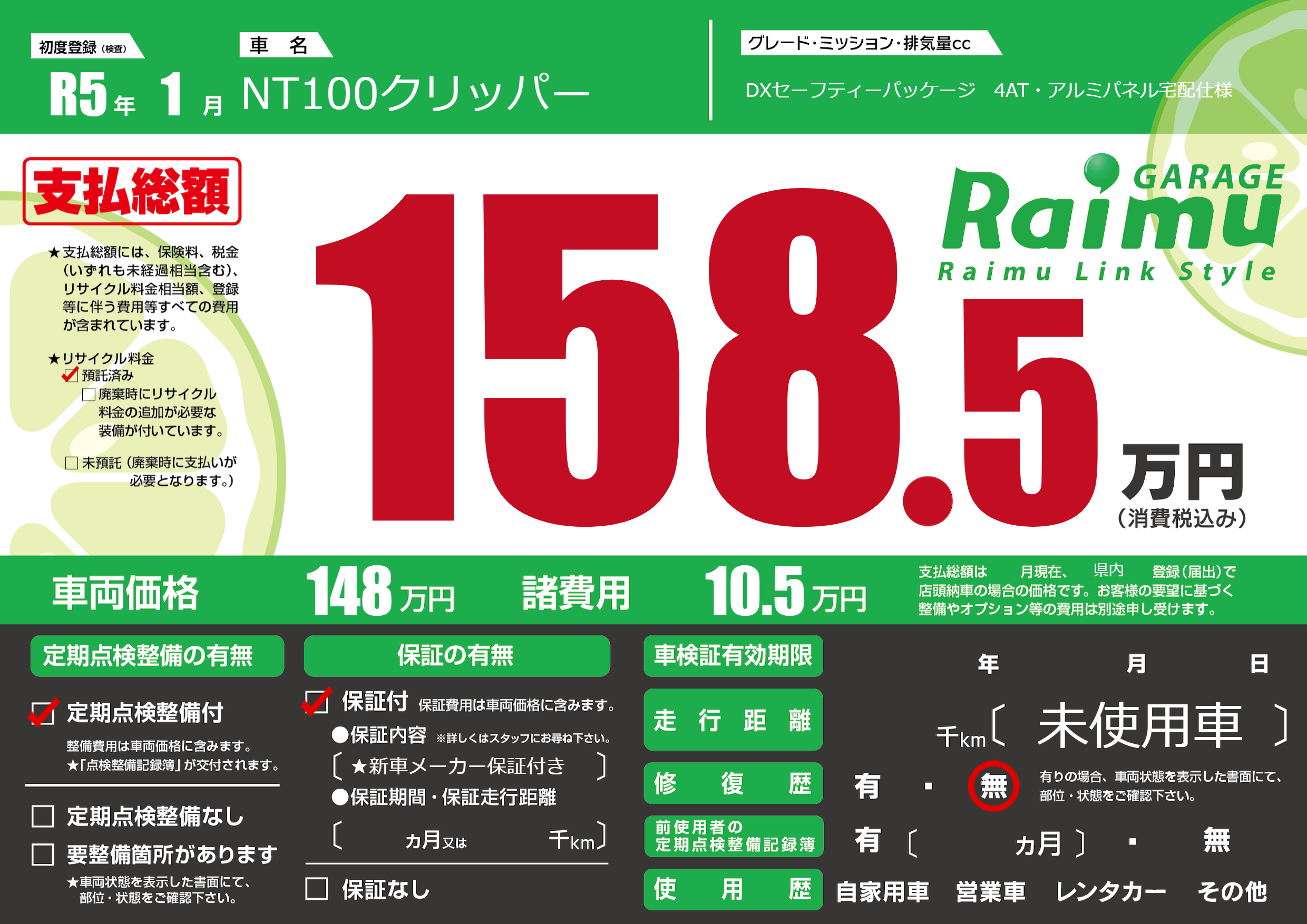 | 車名 | NT100クリッパー | グレード ミッション 排気量 |