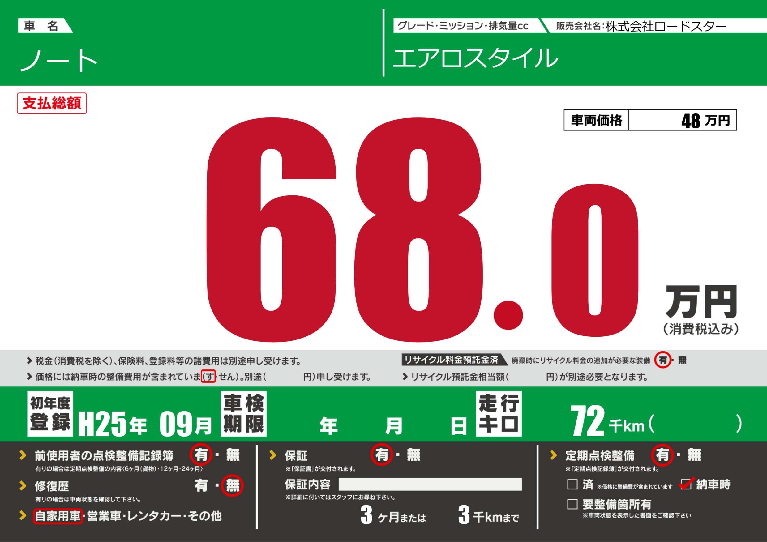 | 定期点検整備 | 定期点検整備あり 納車時あり | ||