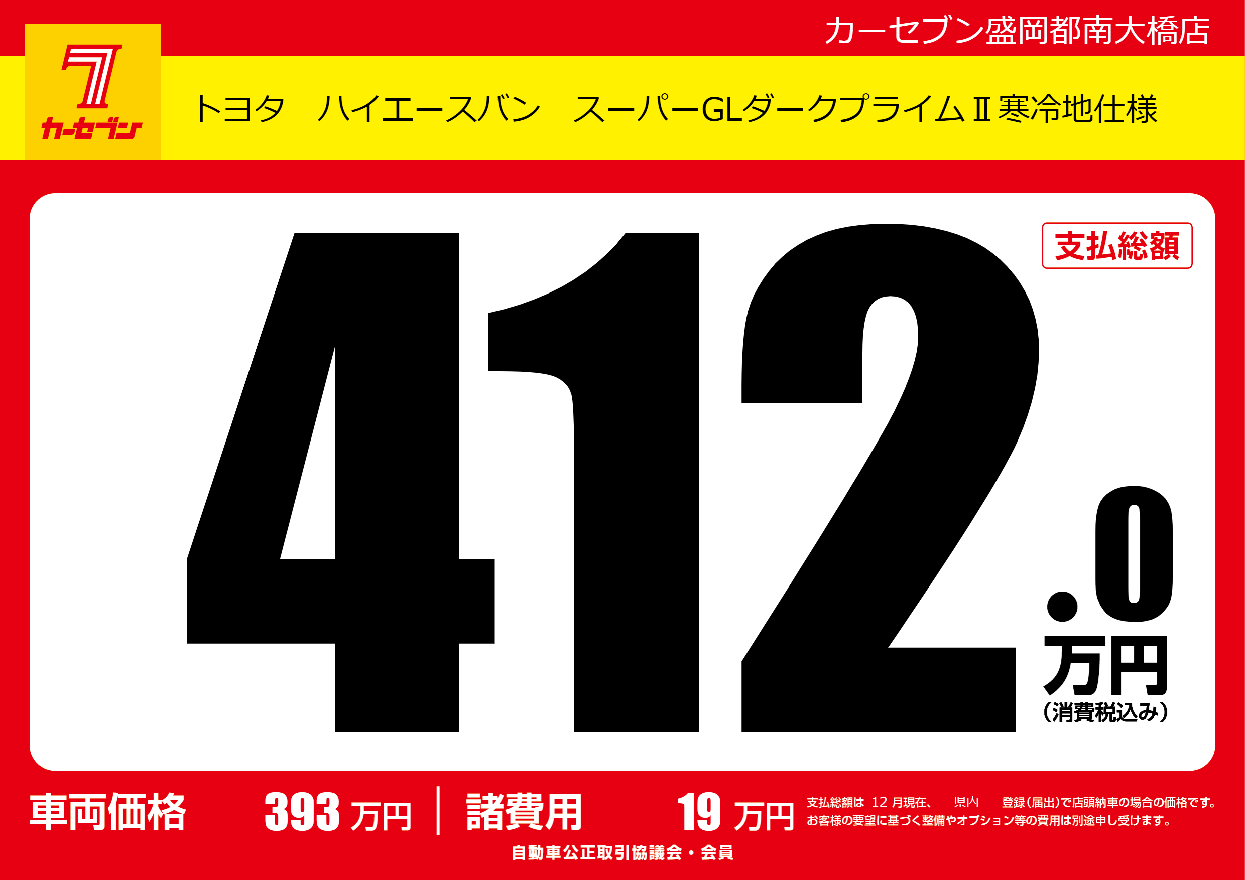 | 車名 | トヨタ ハイエースバン スーパーGLダークプライムⅡ寒冷地仕様 | グレード ミッション 排気量 |