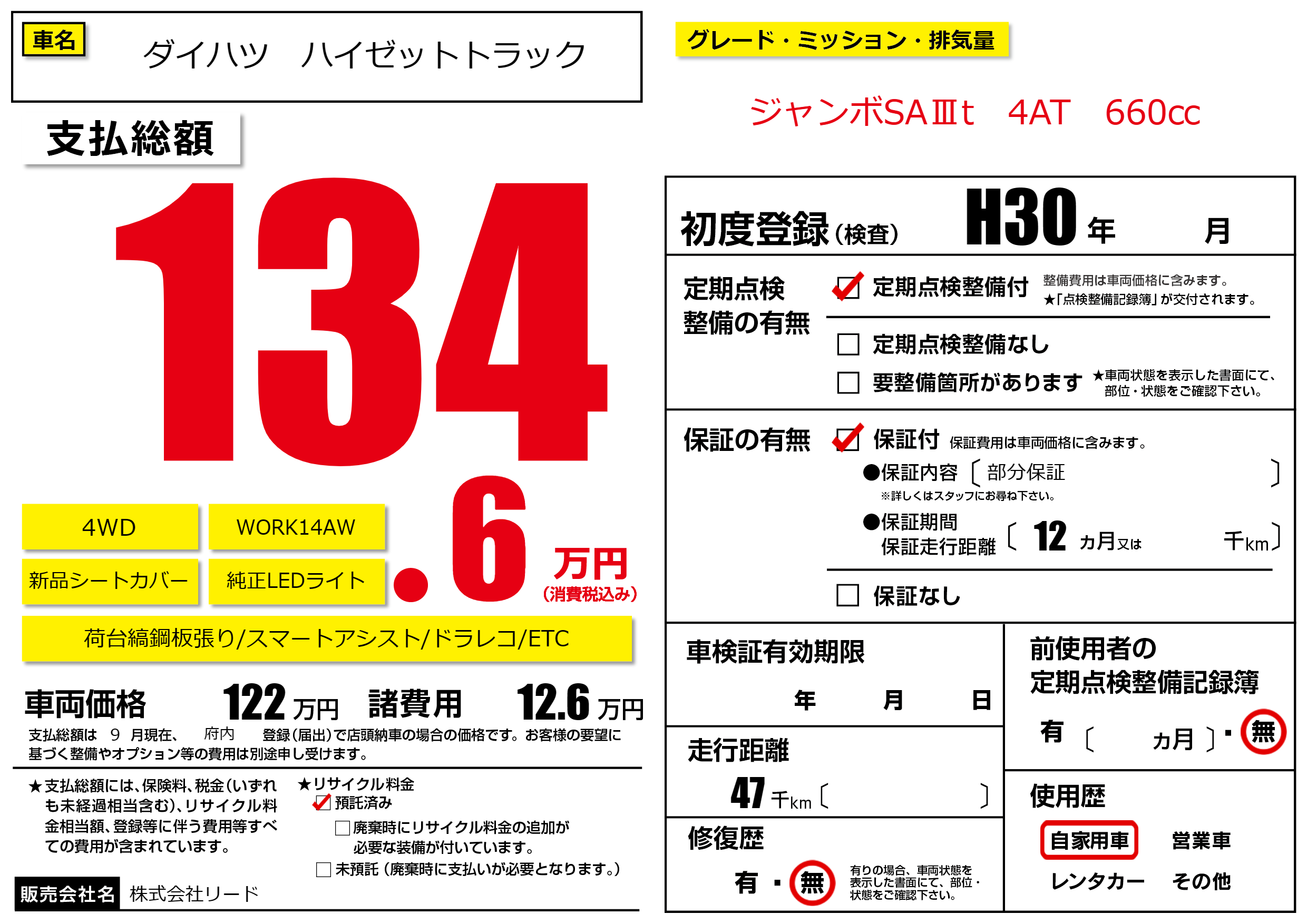 保証なし 保証内容(部分保証) 12ヶ月または()千kmまで |