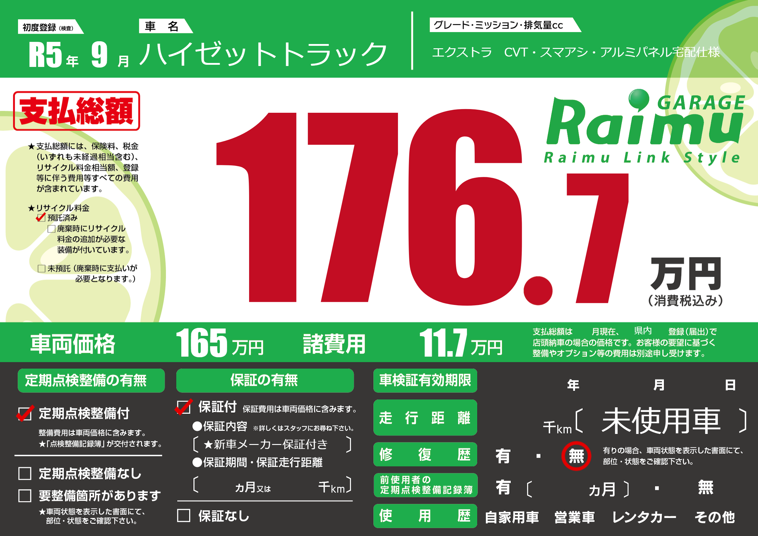 保証付き 保証内容(★新車メーカー保証付き) ヶ月または千km |