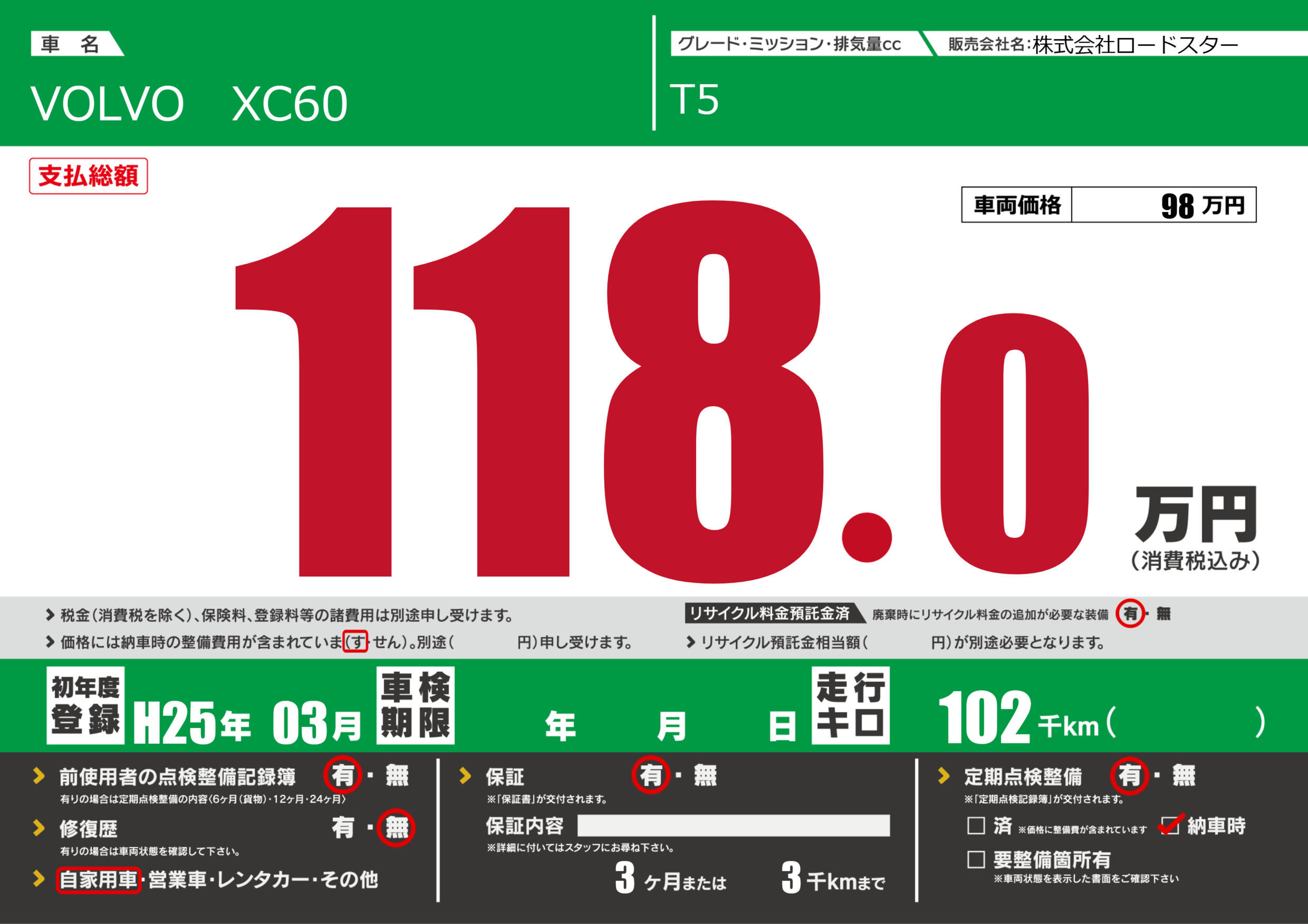 | 車名 | VOLVO XC60 | グレード ミッション 排気量 |
