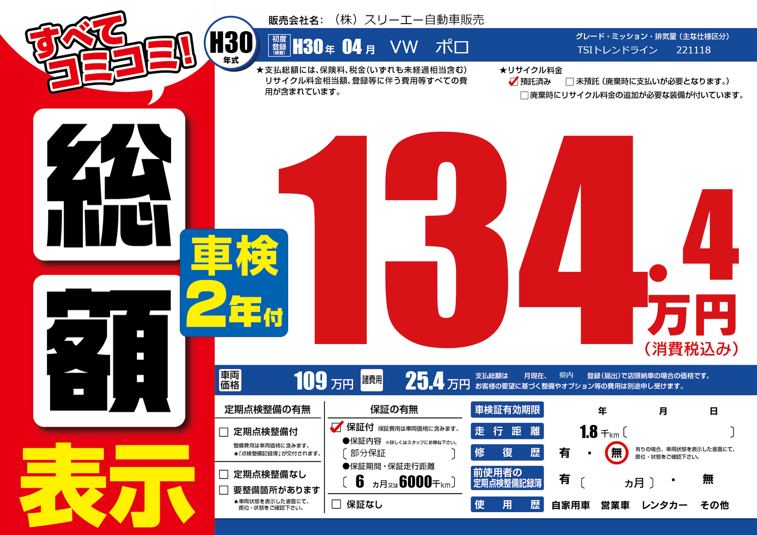 保証付き 保証内容(部分保証) 6ヶ月または(6000)千kmまで |