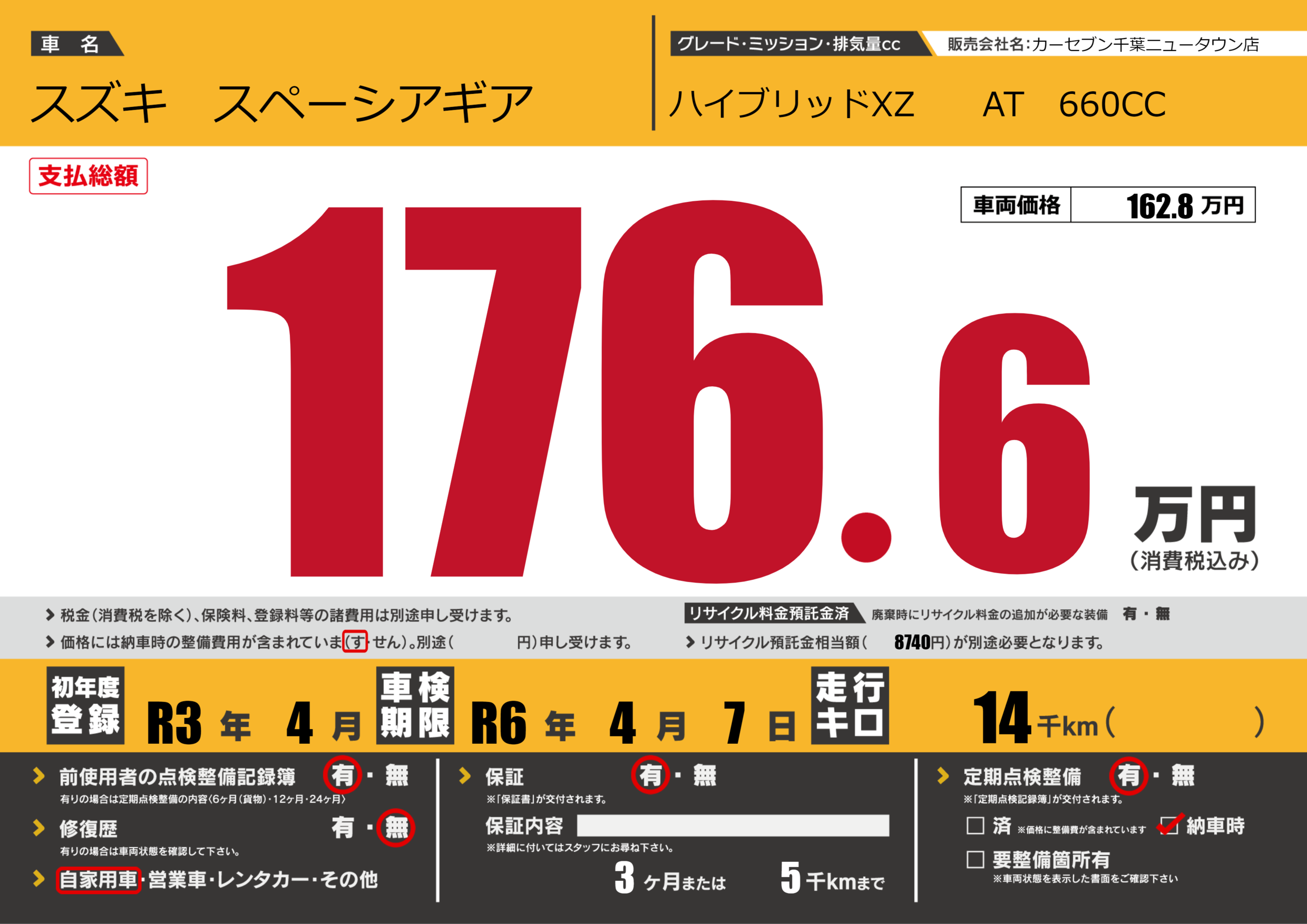 | 定期点検整備 | 定期点検整備あり 納車時あり | ||