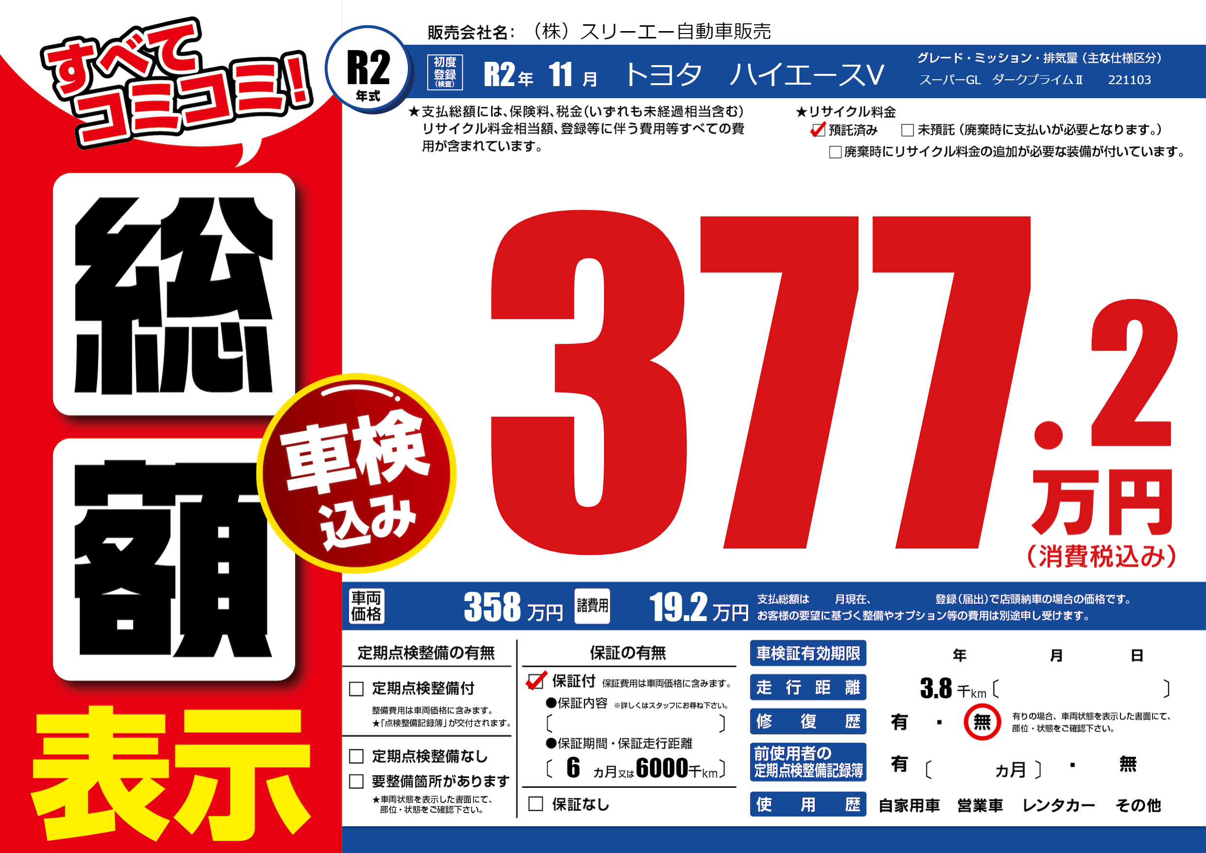 | 車名 | トヨタ ハイエースV | グレード ミッション 排気量 |