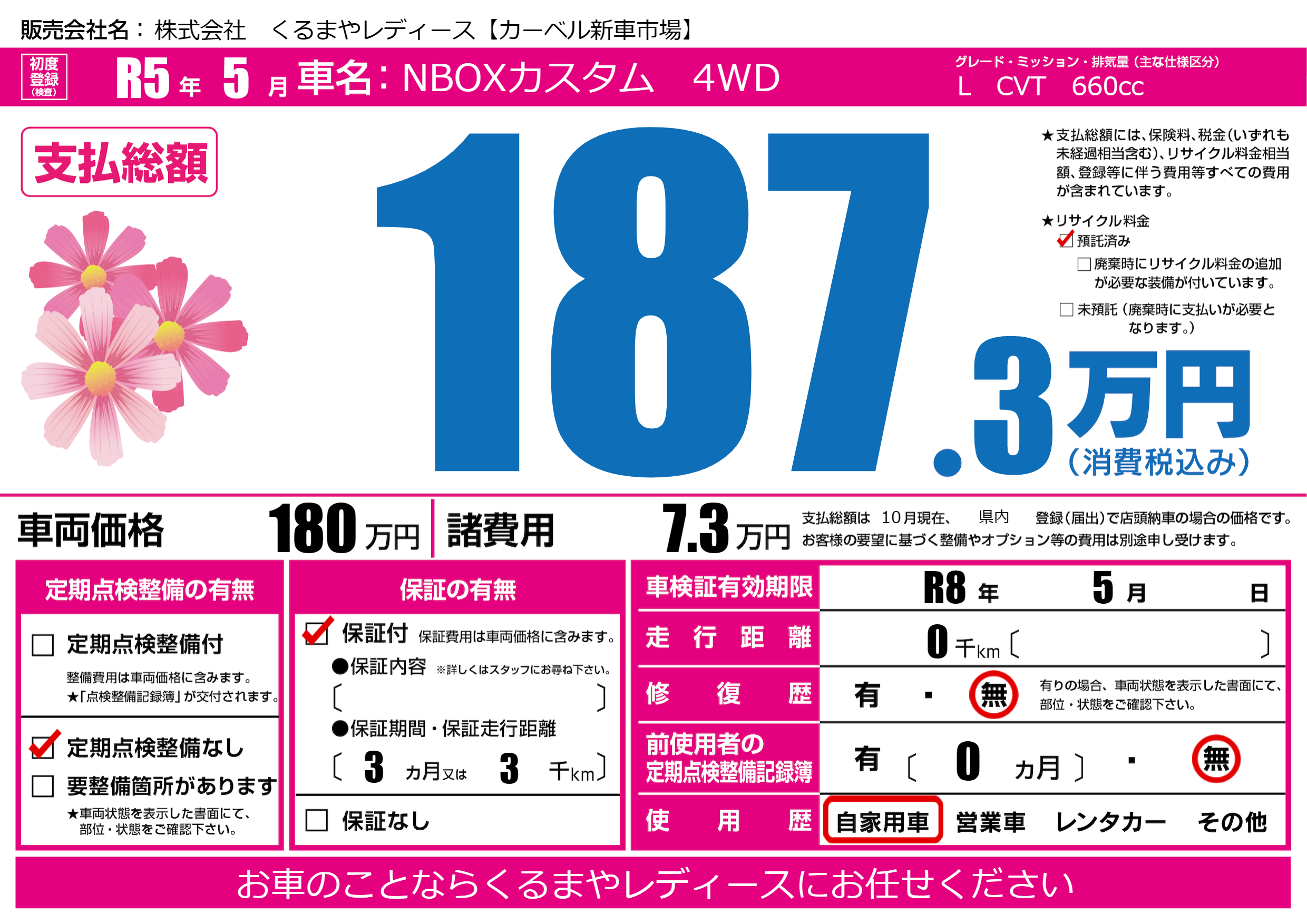 | 車名 | NBOXカスタム 4WD | グレード ミッション 排気量 |